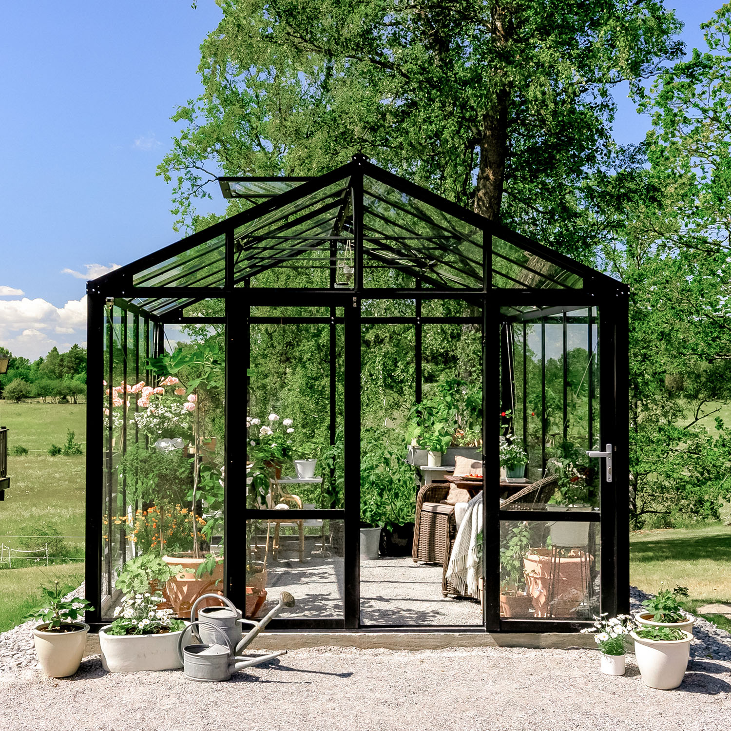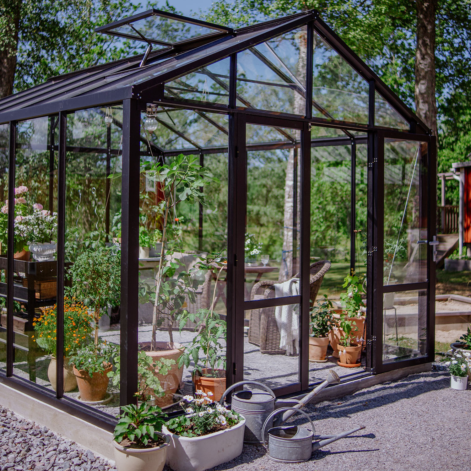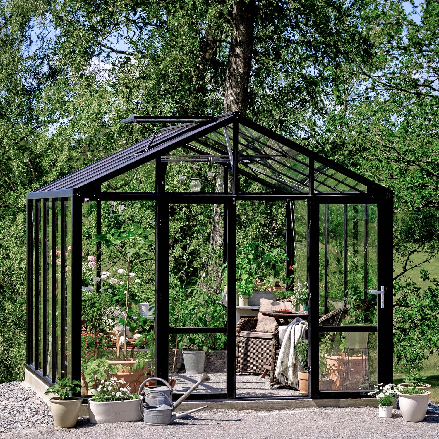 Kasvihuone on varusteltu lukolla, kattoikkunoilla automaattisilla avaajilla, ovistoppareilla, integroitudulla sokkelilla sekä sadevesikouruilla. Nämä ominaisuudet ovat tavallisesti lisävalintoja, mutta sisältyvät valmiiksi tähän kokonaisuuteen. Integroitu sokkeli helpottaa asennusta ja tekee kasvihuoneesta vankemman. Pariovi takaa helpon kulun sekä tekee tilasta kutsuvan. Tässä tilassa on helppo kestitä vieraita.