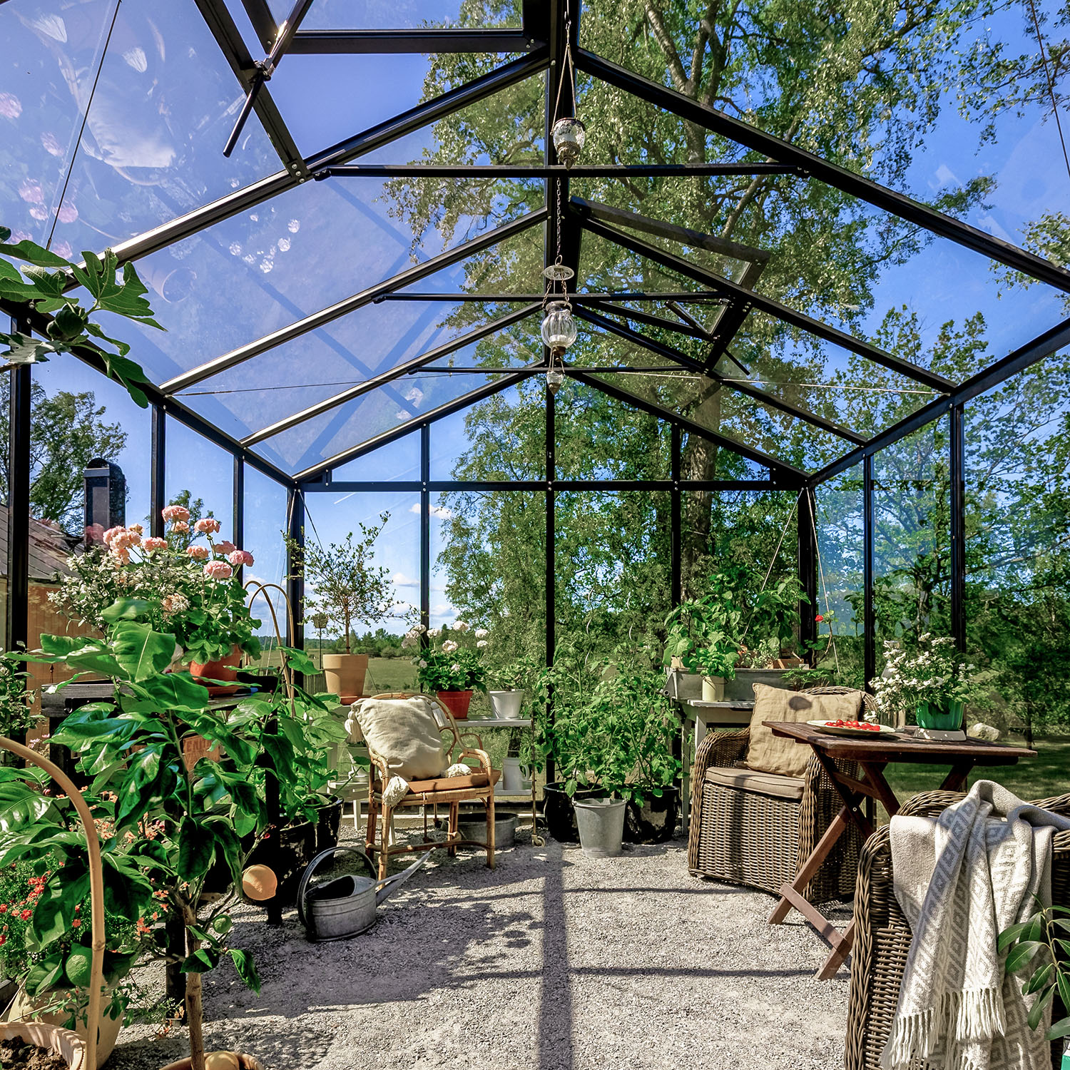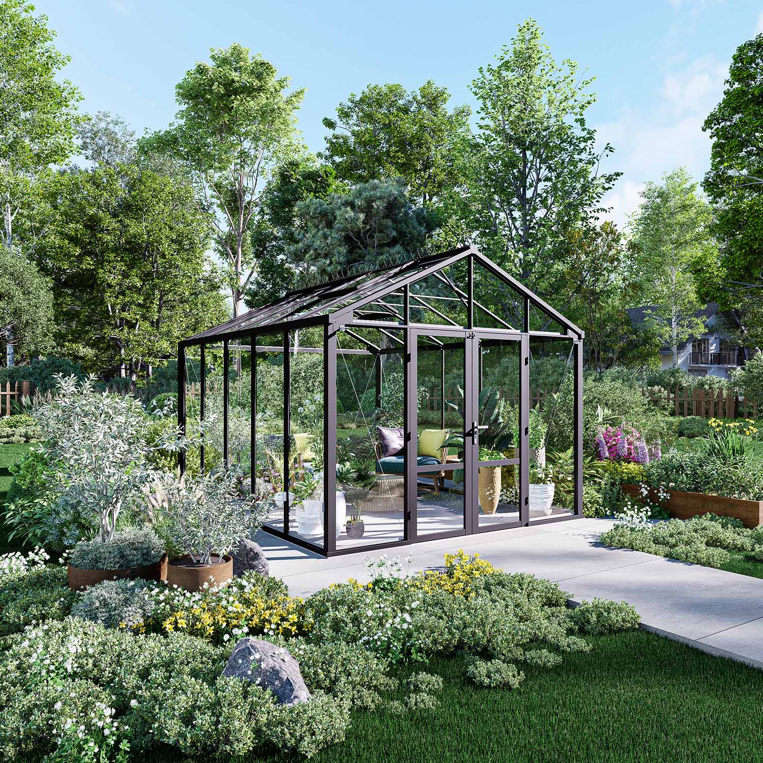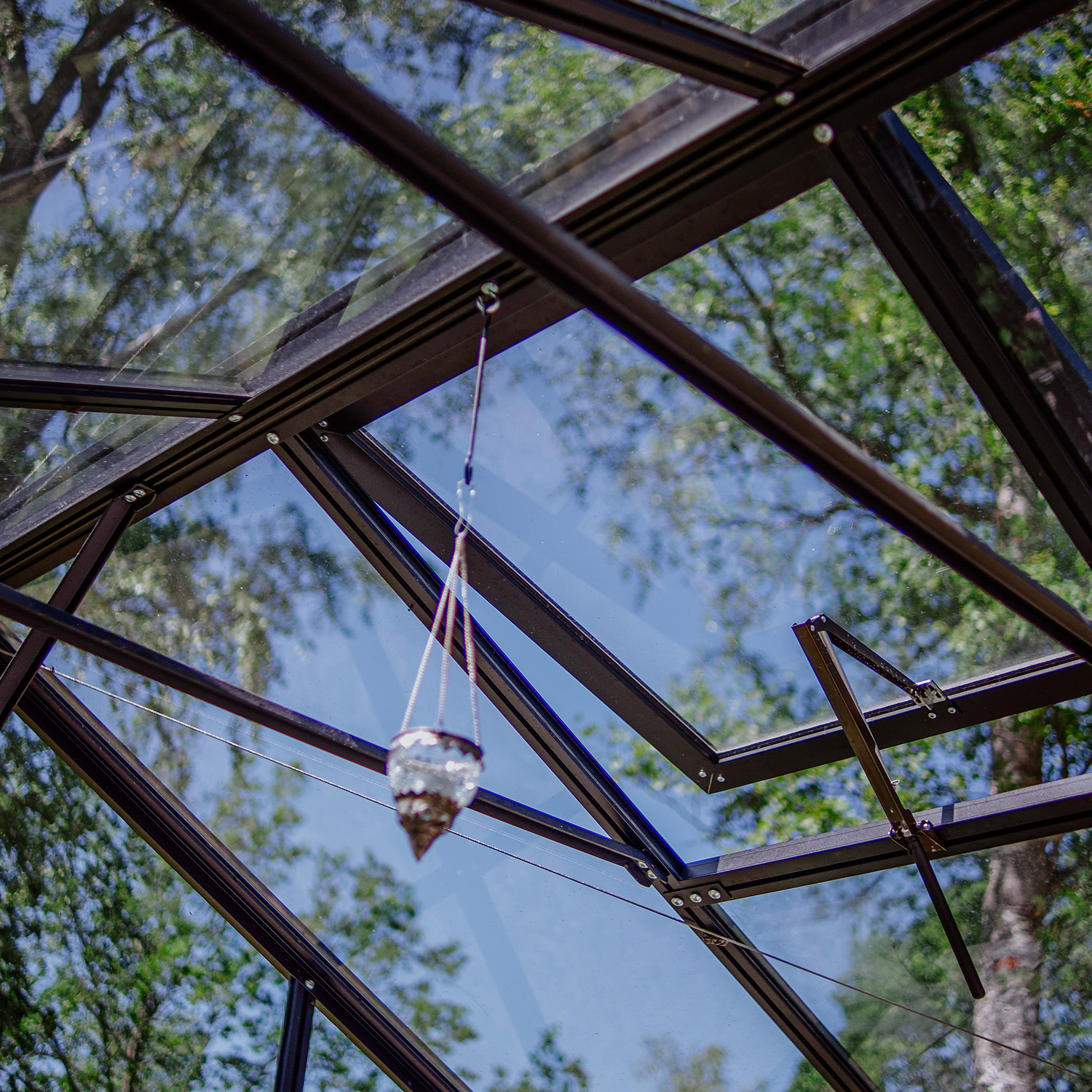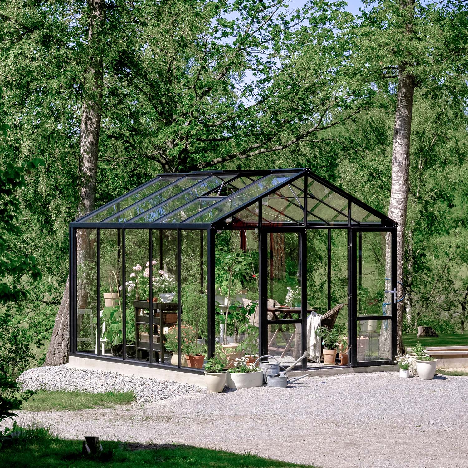 Kasvihuone on varusteltu lukolla, kattoikkunoilla automaattisilla avaajilla, ovistoppareilla, integroitudulla sokkelilla sekä sadevesikouruilla. Nämä ominaisuudet ovat tavallisesti lisävalintoja, mutta sisältyvät valmiiksi tähän kokonaisuuteen. Integroitu sokkeli helpottaa asennusta ja tekee kasvihuoneesta vankemman. Pariovi takaa helpon kulun sekä tekee tilasta kutsuvan. Tässä tilassa on helppo kestitä vieraita.