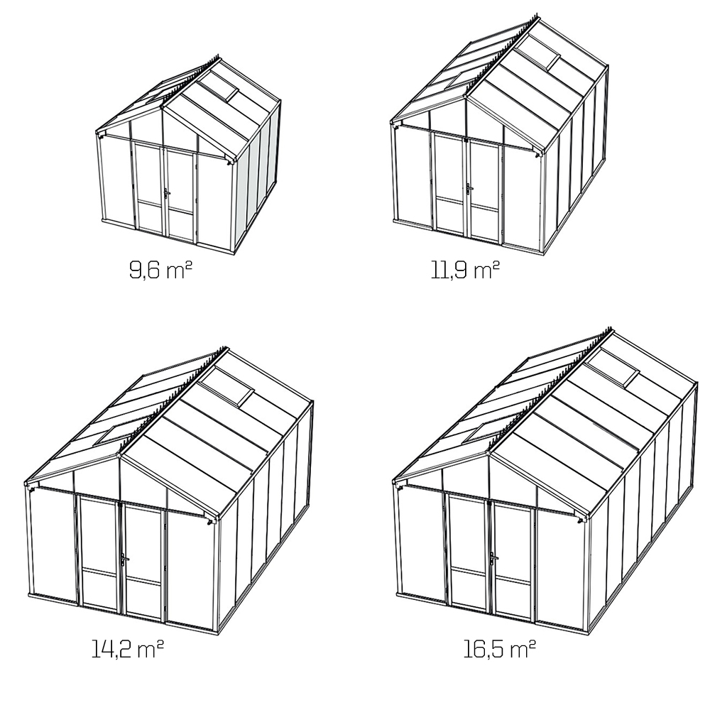 Tuotekuvat esittävät Dahlia-kasvihuonetta, jonka koko on 11,9 m².