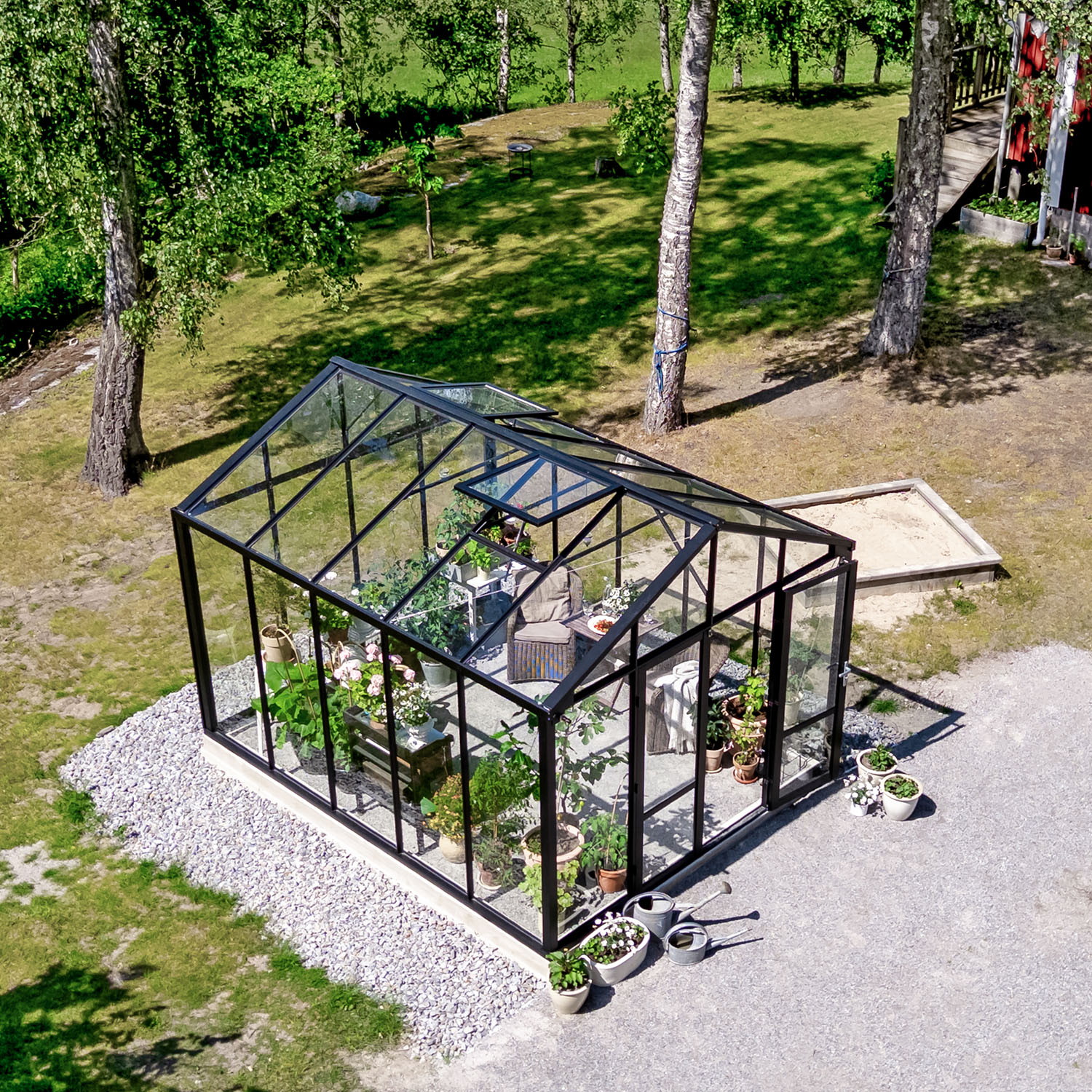 Kasvihuoneen runko on tyylikkään musta (RAL9005) ja lasit ovat 4 mm turvalasia sekä seinissä että katossa. Runko on jauhemaalattu rakennelakalla, joka tekee pinnasta kulutuskestävämmän sekä antaa sille viimeistellymmän ulkonäön.