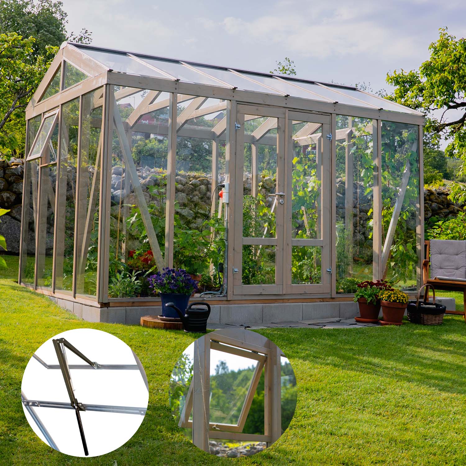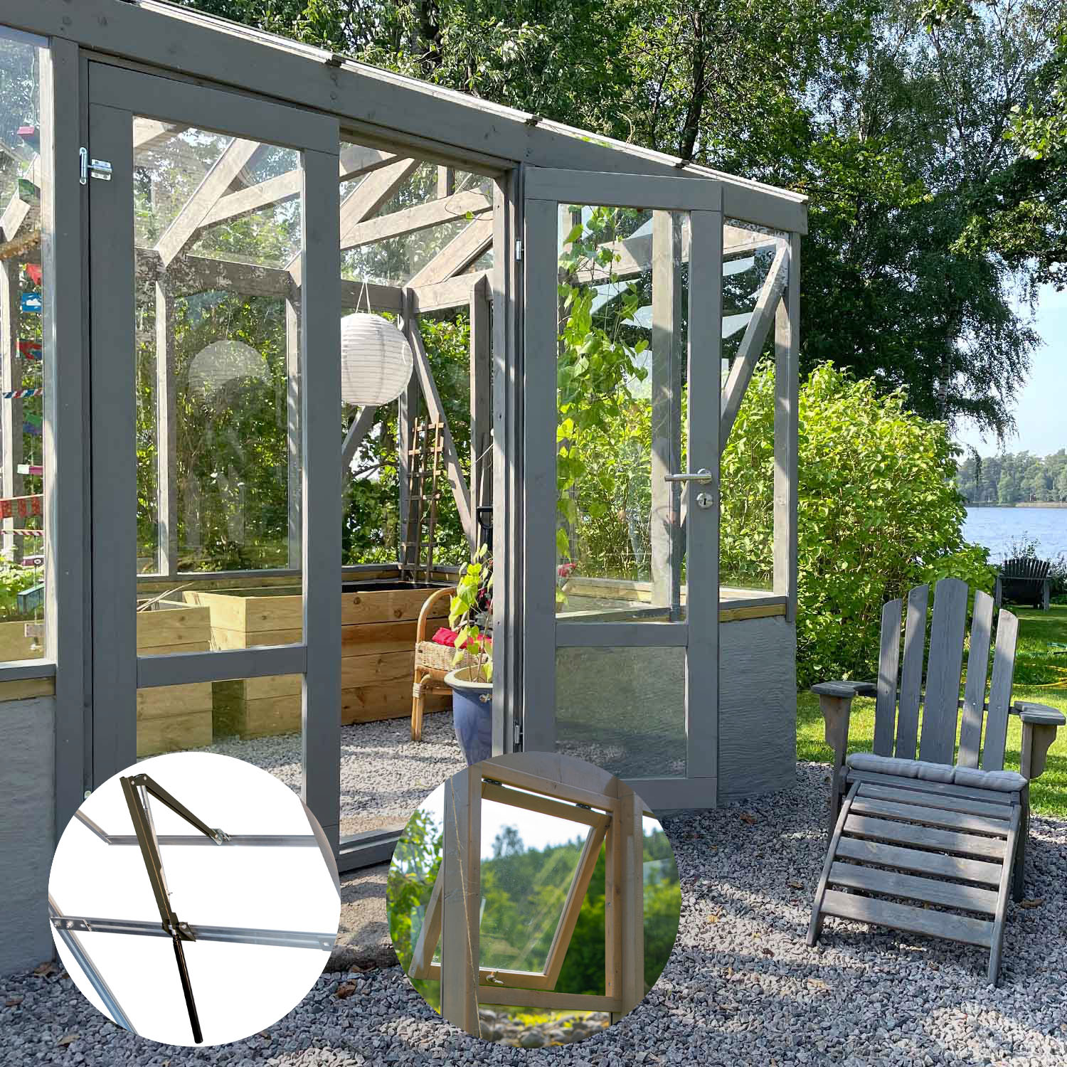 Linneassa on reilu kattokorkeus, joten täällä sinun tomaatti- ja viinitaimesi pääsevät kasvamaan vapaasti. Älykkään rakenteen ansiosta voit itse valita haluatko sijoittaa kasvihuoneen kaksoisoven pitkälle vai lyhyelle sivulle.