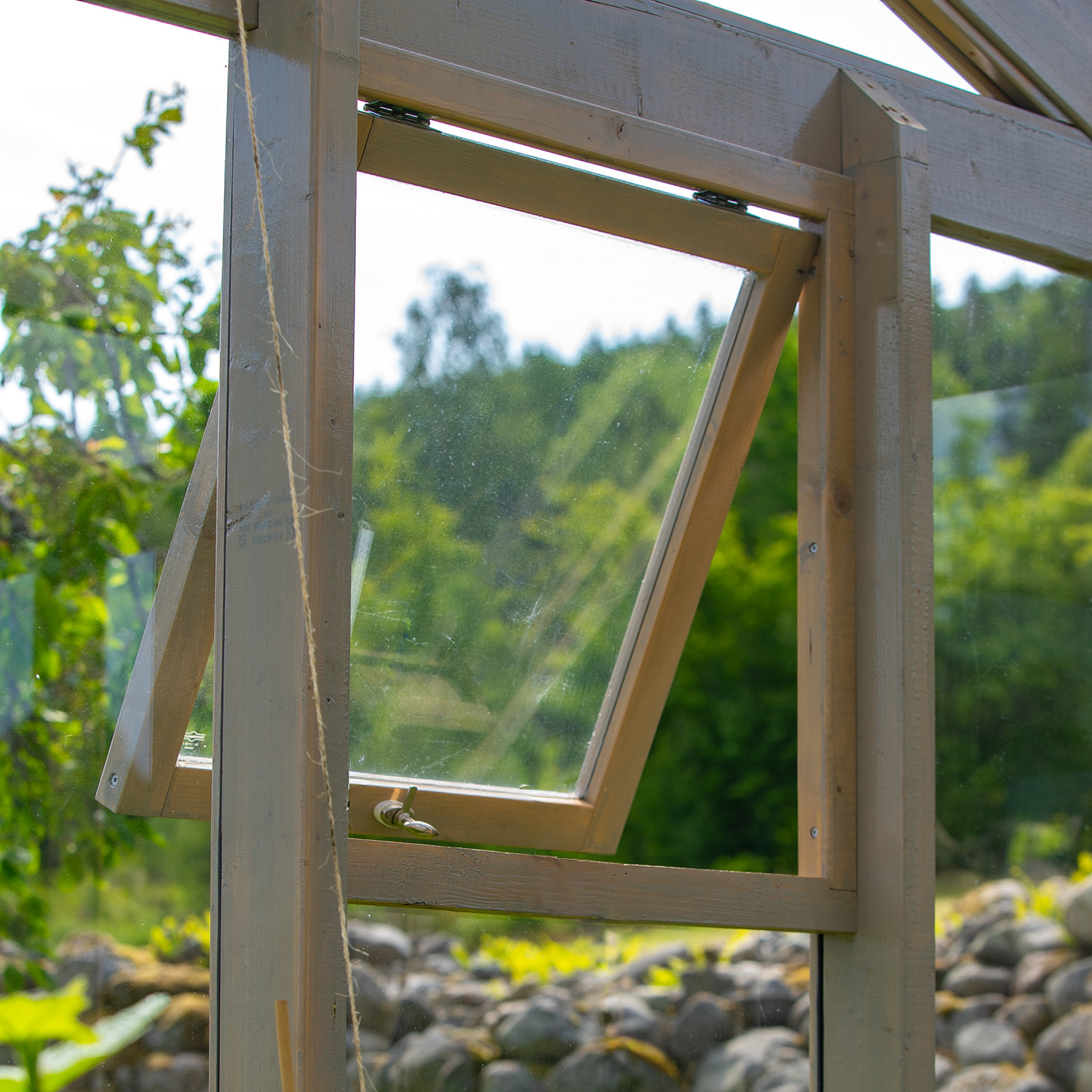 Suosittelemme kasvihuoneeseen vähintään yhtä ikkunaa, jotta läpituuletus olisi kuumalla ilmalla mahdollista. Kasvihuoneeseen voi tarvittaessa asentaa monta ikkunaa. Ikkunan voi myös jälkiasentaa, mutta se on kuitenkin helpointa tehdä kasvihuonetta rakennettaessa.