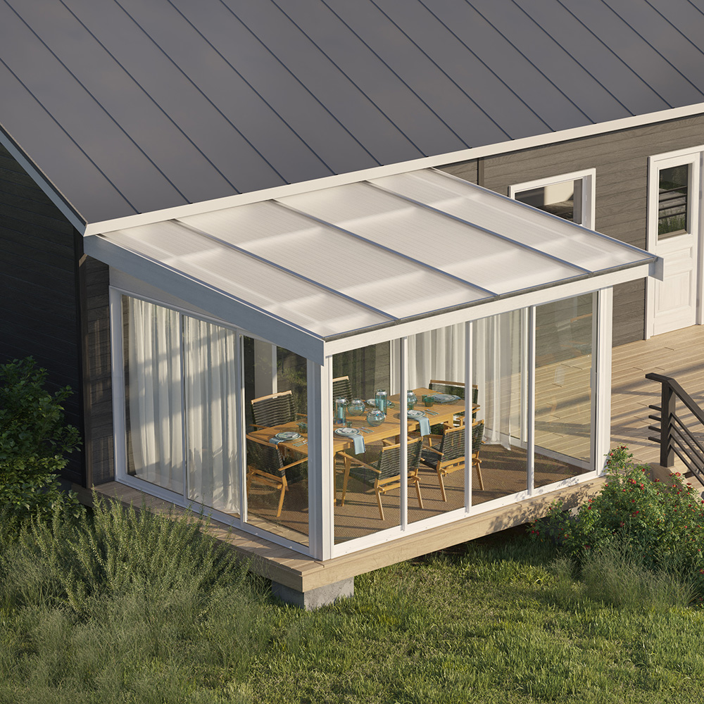 Voimassa ostaessasi lasiterassipaketin, johon sisältyy kennomuovikatto, liukuelementit ja liimapuurunko, 2.3. asti.Rauma on todella tyylikäs erillinen lasiterassi, joka sopii erinomaisesti esim. uima-altaan tai merenrannan äärelle. Klassista harjakattoa täydentävät liukuvat ja kiinteät lasiosiot kolmella sivulla sekä vankkarakenteinen paneeliseinä