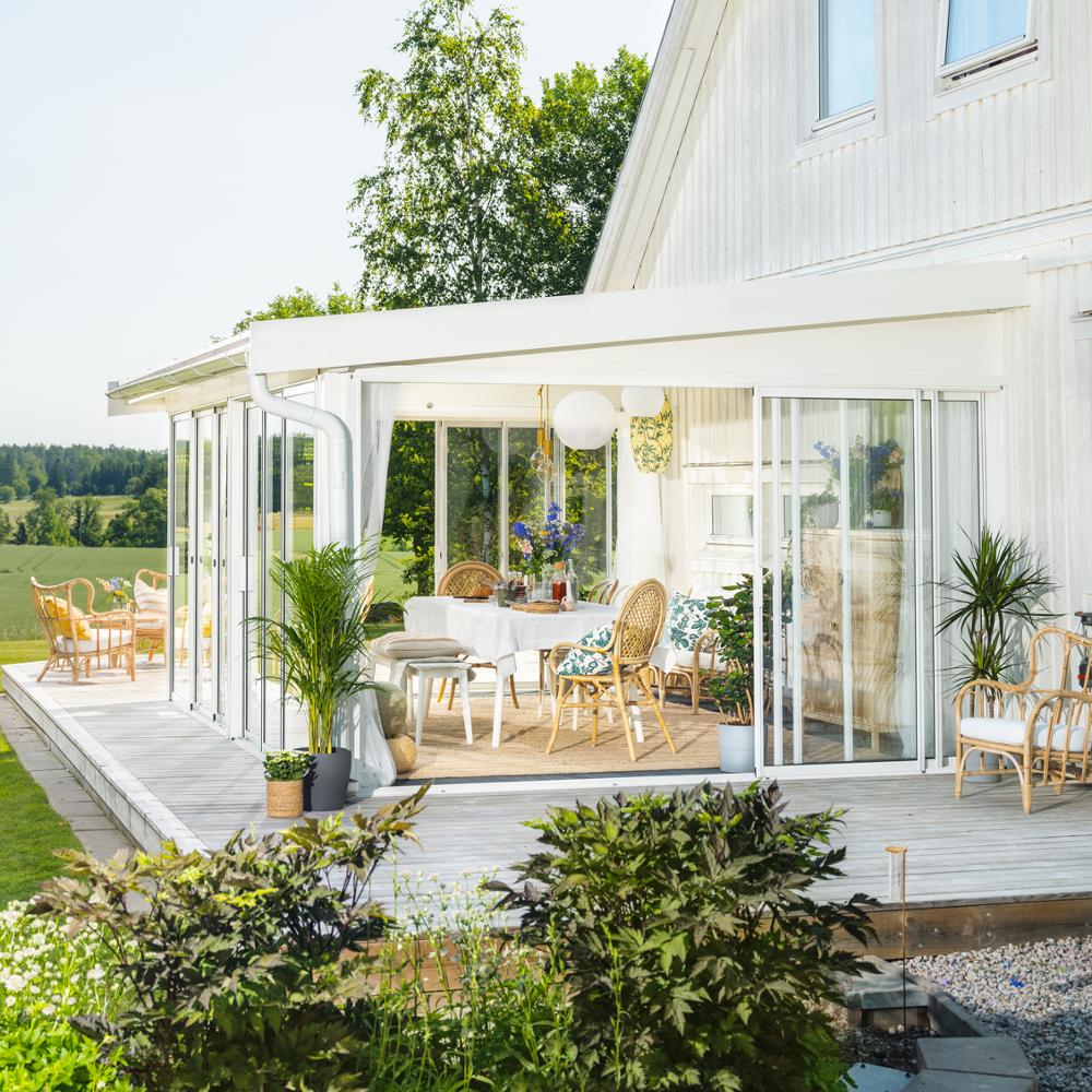 Nauti lasiterassista suurimman osan vuodesta. Maaliskuusta marraskuuhun saat paremmin eristetyn lasiterassin. Lasielementit eristyskaseteilla: Isolent-liukuovet. Katto: 32 mm kennomuovikatto