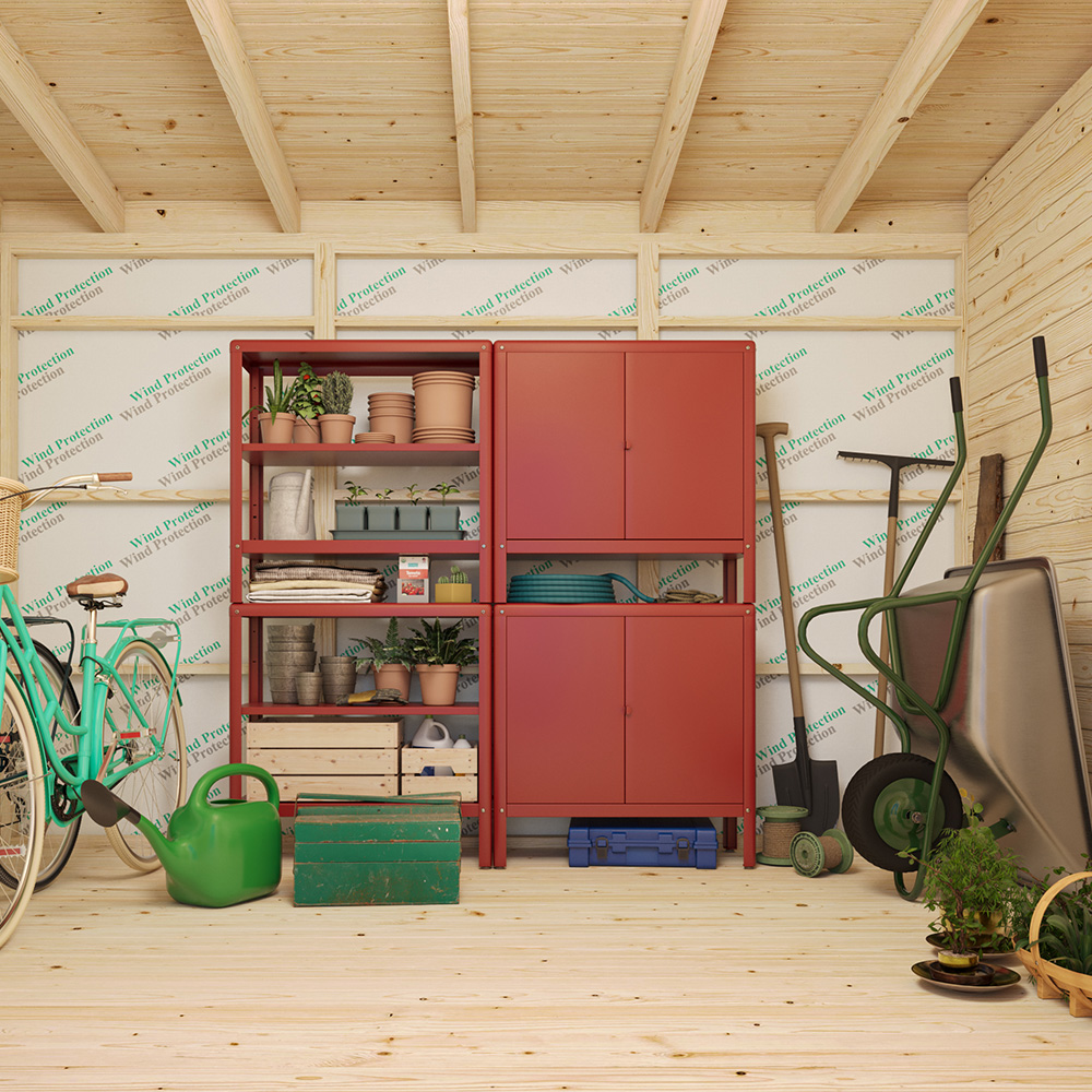 Suuri ja vankkarakenteinen, kaksiosainen varasto, jossa kaksi erillistä sisäänkäyntiä. Antaa todella mahdollisuuksia varastoitavien tavaroiden erittelyyn. Kaksoisoven ansiosta pyörien ja muiden välineiden sisäänvieminen ja ulosottaminen on helppoa.