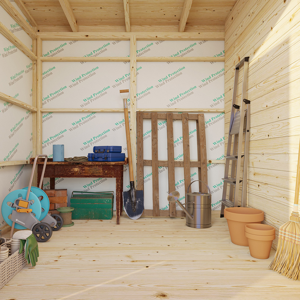 Toisella puolella on pieni varasto puutarhavälineille ym. Varaston voi eristää, mikäli tila halutaan suojata pakkaselta. Seinien 70 mm vahvuus mahdollistaa eristämisen.