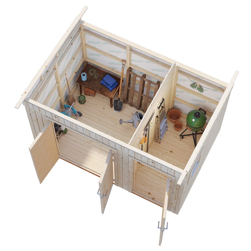 Antaa hyvät mahdollisuudet varastoitavien tavaroiden erittelyyn. Kaksoisoven ansiosta pyörien ja muiden välineiden sisäänvieminen ja ulosottaminen on helppoa.