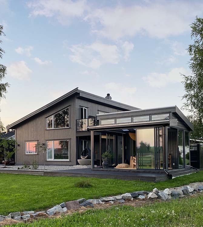- Vi såg hela tiden annonser för uterum så vi klickade oss in på en av dem för att läsa mer. Det är väldigt öppen terräng här och det blåser en del. De två första somrarna här testade vi olika vindskydd, med blandad framgång, och kom fram till att ett uterum med glasdörrar skulle vara perfekt. Först tänkte vi själva designa det i samma stil som huset, men efter att vi hittade 'lycka' tyckte vi att det var rätt likt i stilen, och det var både billigare och mer tidseffektivt än att beställa material själv.