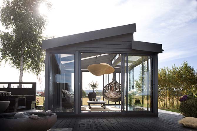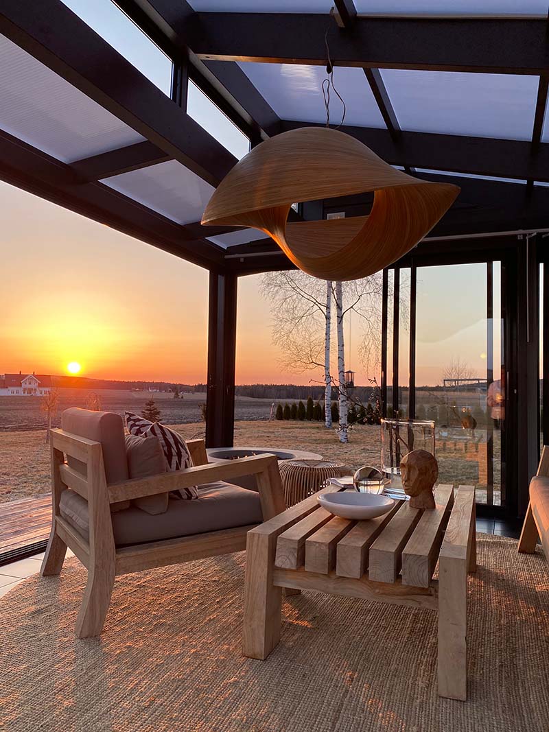 - Att ta med sig kaffekoppen ut på morgonen och krypa upp i den härliga hängstolen och bara njuta av stillheten och fågelkvitter. Vi tycker också att det är trevligt att ha gäster i uterummet, och så härligt att sitta där och titta på solnedgången med något gott i glaset. Uterummet är vår-/höstisolerat, men vi använder det också när det är fint väder på vintern. Då tänder vi eldstaden för att göra det varmt och mysigt.
