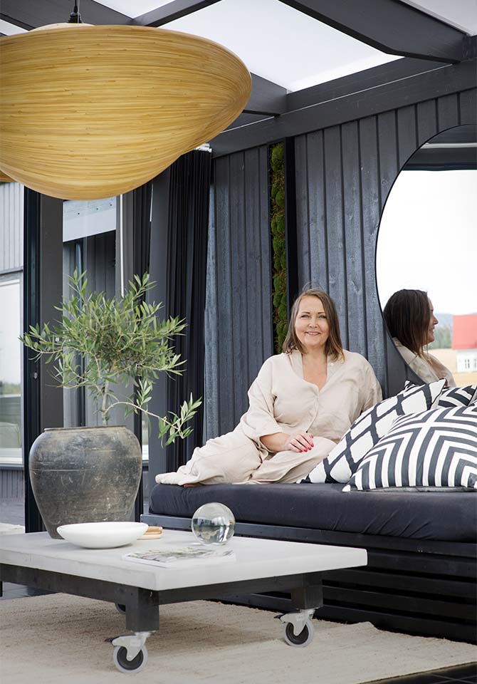 - Jag ville att uterummet skulle vara helt annorlunda jämfört med vardagsrummet inne, så här måste det finnas trädgårdsmöbler. Stilen är modern och väldigt personlig, en blandning av designmöbler och möbler gjorda av husets möbelsnickare. Hängstolen med den härliga kudden är den bästa sittplatsen, så där gäller det att vara först till kvarn. Den stora spegeln får rummet att se större ut och speglar naturen utanför. Den gedigna taklampan i bambu är ett blickfång och jag älskar den!