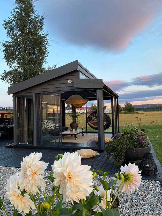 - Det är att det förlänger trädgårdssäsongen, för även om det är rått ute så är det varmt och skönt inne i uterummet. Särskilt i mars/april och september/oktober gör uterummet att vi sitter ute mer. Vi öppnar upp för värmande solstrålar och stänger igen för kalla vindar. Det är också mysigt när regnet smattrar på taket och man sitter torrt och inte behöver fly in med kuddar och sånt.