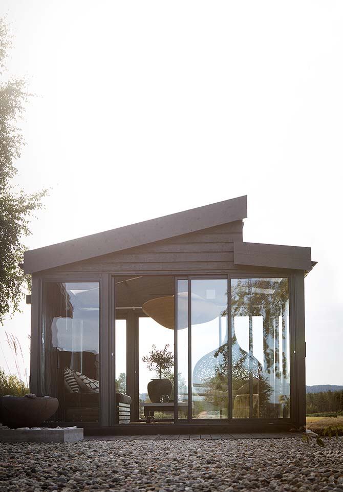 - Jag skulle fråga mig själv hur stor yta jag behöver, och ska uterummet rymma en lounge, ett matbord eller både och? Det är också viktigt att fråga sig själv om det ska användas hela eller delar av året. Vi valde ett uterum från vår till höst. Vi la mycket tid på placeringen av uterummet, och gjorde en mall som vi flyttade runt för att lättare se hur den var placerad i förhållande till solen, utsikten från huset, grannar etc. Som det ser ut nu är det snyggt integrerat i resten av utemiljön, där bakväggen fungerar som ett vindskydd för matplatsen. Vi har sol in i uterummet från tidig morgon tills att solen går ner över åkern på kvällen.