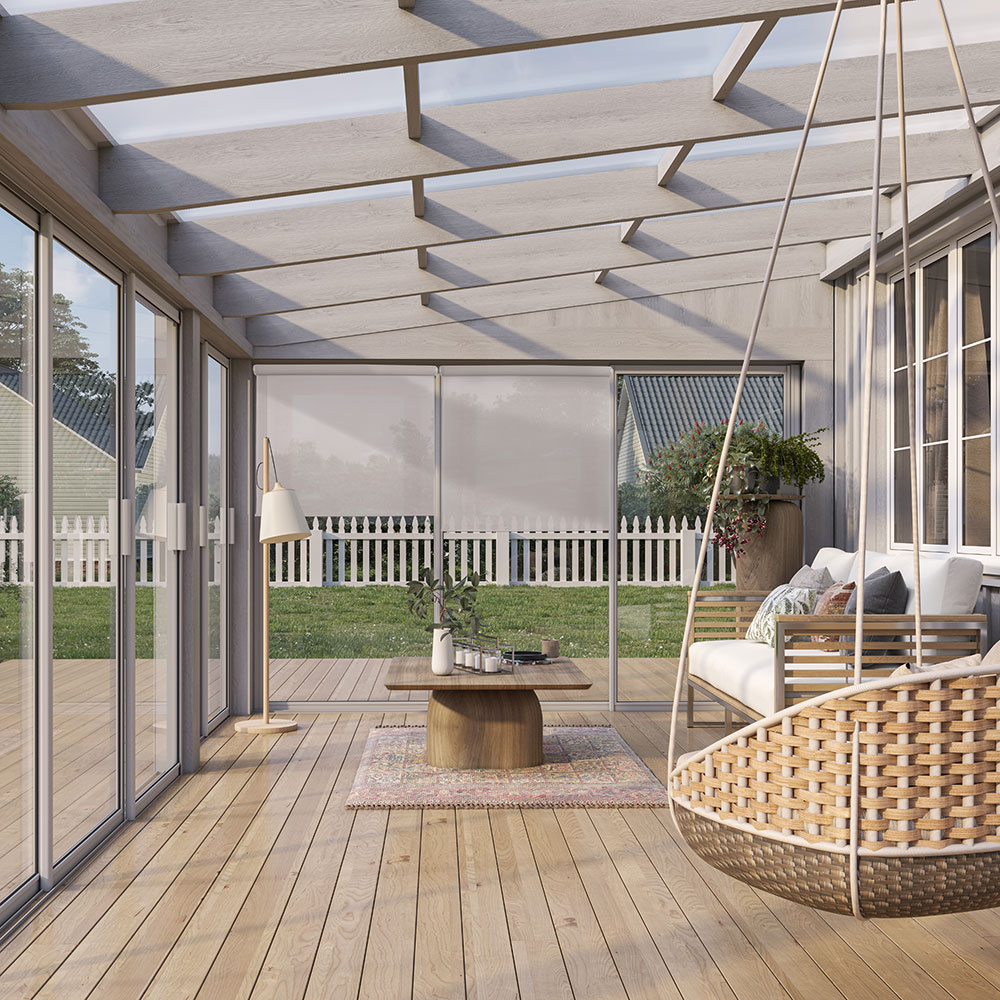 Skapa en trivsam miljö i ditt uterum med hjälp av rullgardinen Skugga R3000. Ett kraftigt och stabilt system för stora rullgardiner med lätt manövrering.
