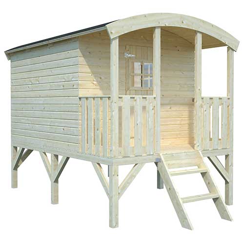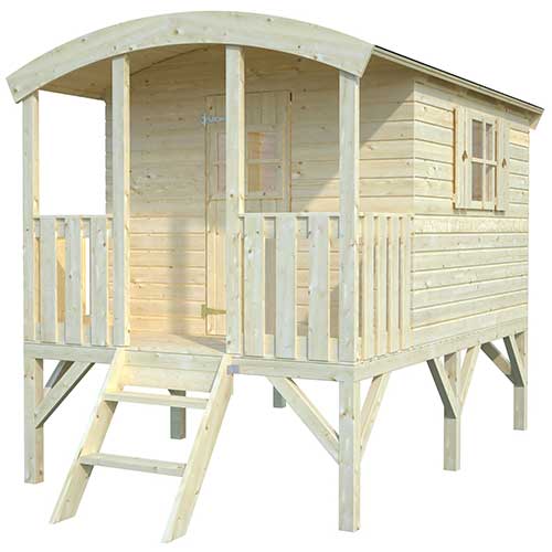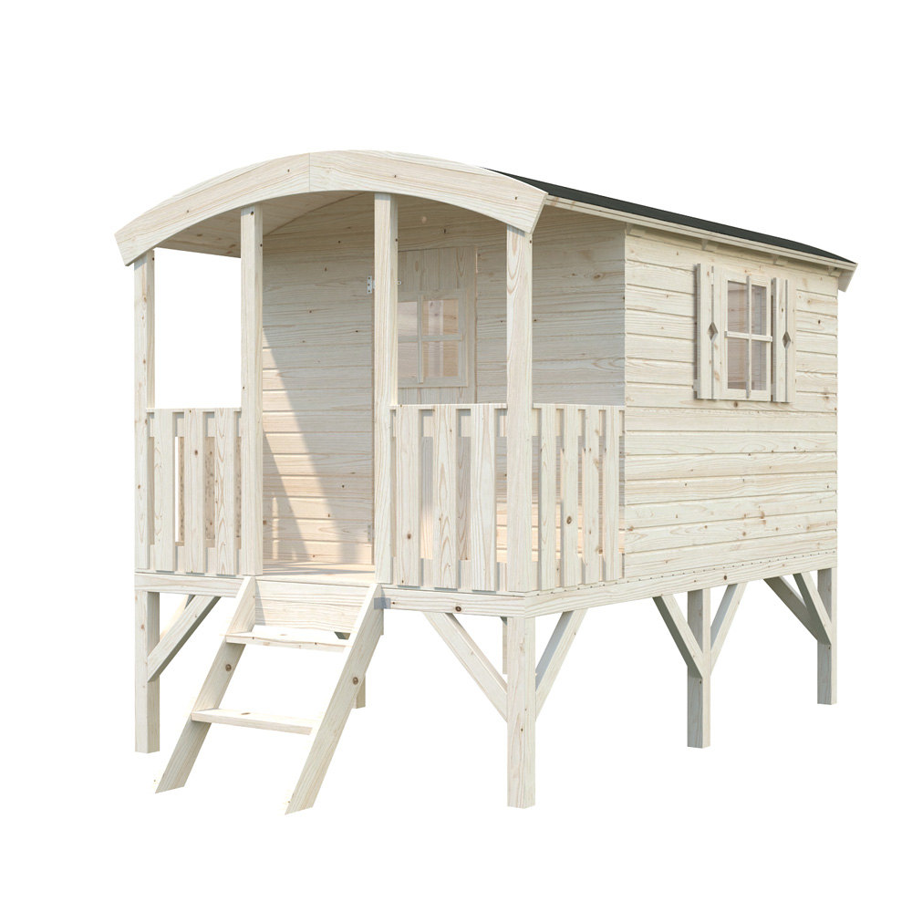 Lekstuga i gran upphöjd på stolpar för barn från 3 år och upp till 50 kilo. Max sex personer samtidigt. Lättmonterad med färdiga väggelement.