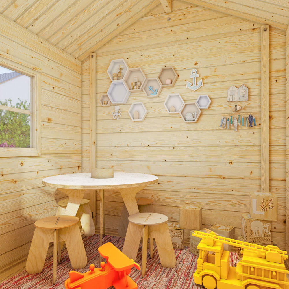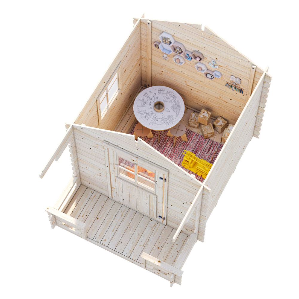 Lättmonterad knuttimrad lekstuga i gran för barn från 3 år och upp till 50 kilo. Max sex personer samtidigt.