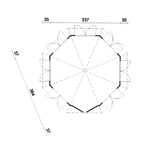 Lusthus i gran. Obehandlat och måste grundoljas, grund- och täckmålas innan användning. Levereras i byggsatser som du själv monterar med hjälp av utförliga monteringsanvisningar.