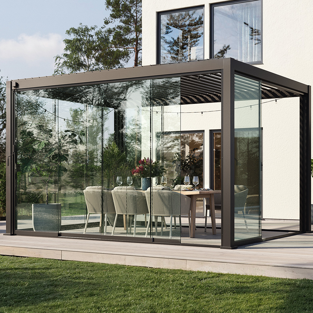 Komplettera din pergola med glasväggar. Vi har tagit fram ett paket av populära Maisema skjutdörrar, designat speciellt för Nordrums Pergola Aluminium 3x3 m. Perfekt passform och i kulörer som matchar din pergola.