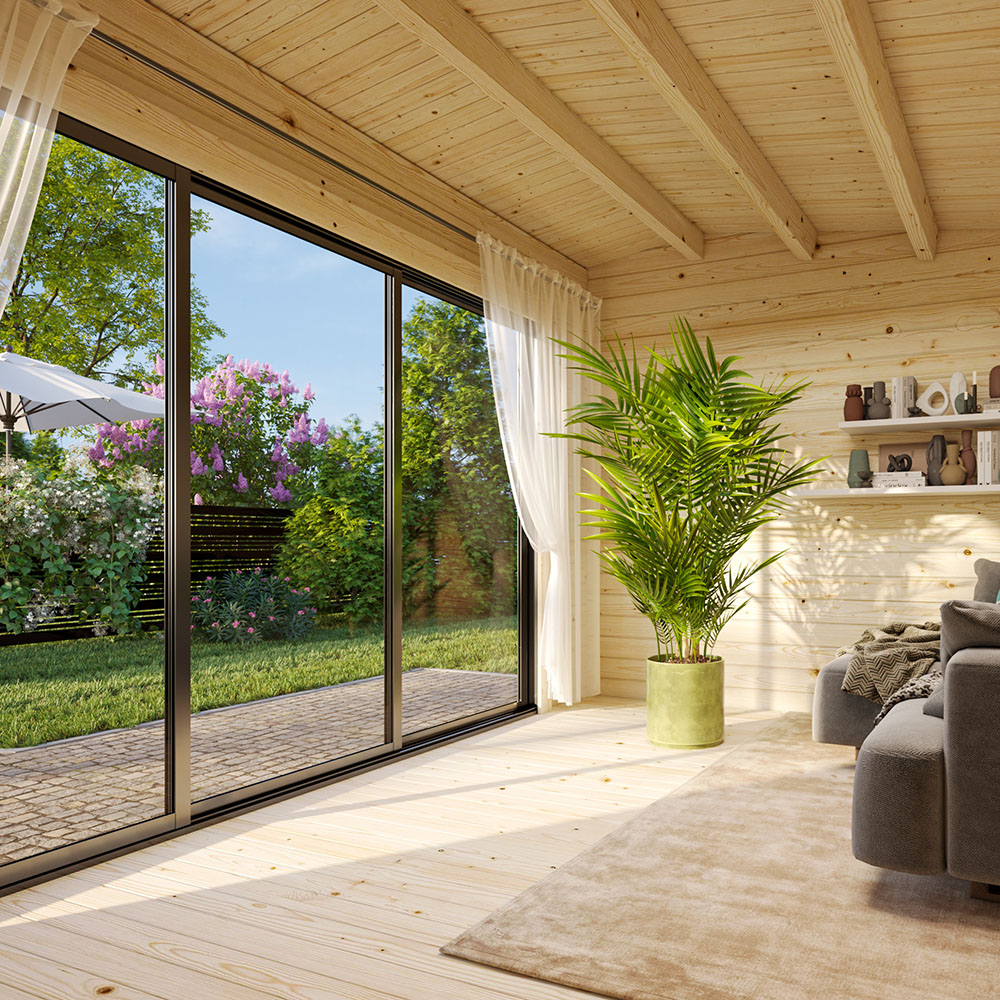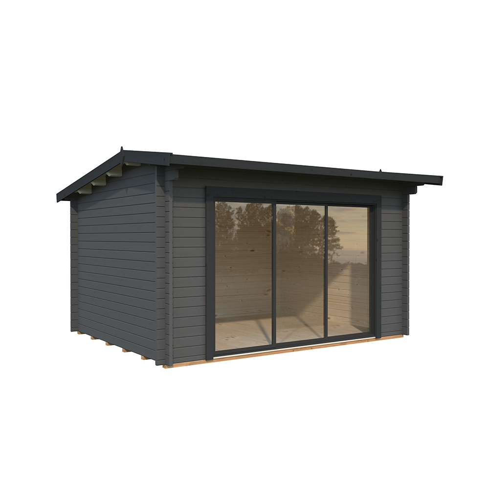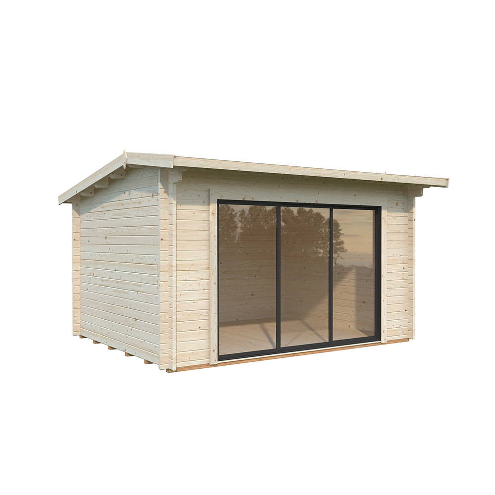 Stugan Ines har generösa skjutdörrar som gör att du verkligen kan öppna upp och släppa in ljus och ljud från din omgivning till stugan. Den moderna stugan är tillverkad av nordisk gran och levereras med äkta glas och fina detaljer.