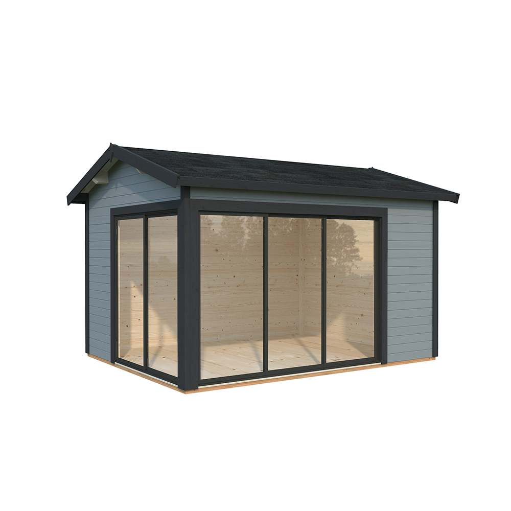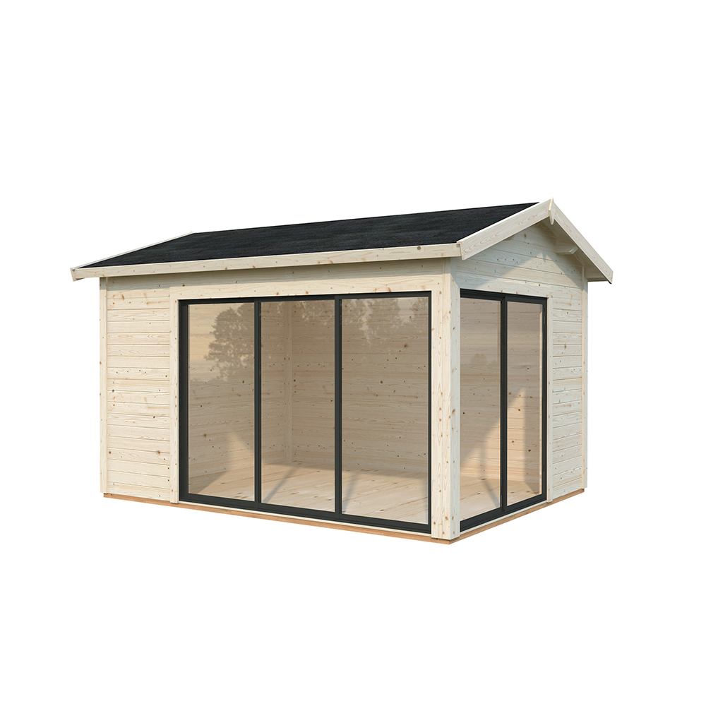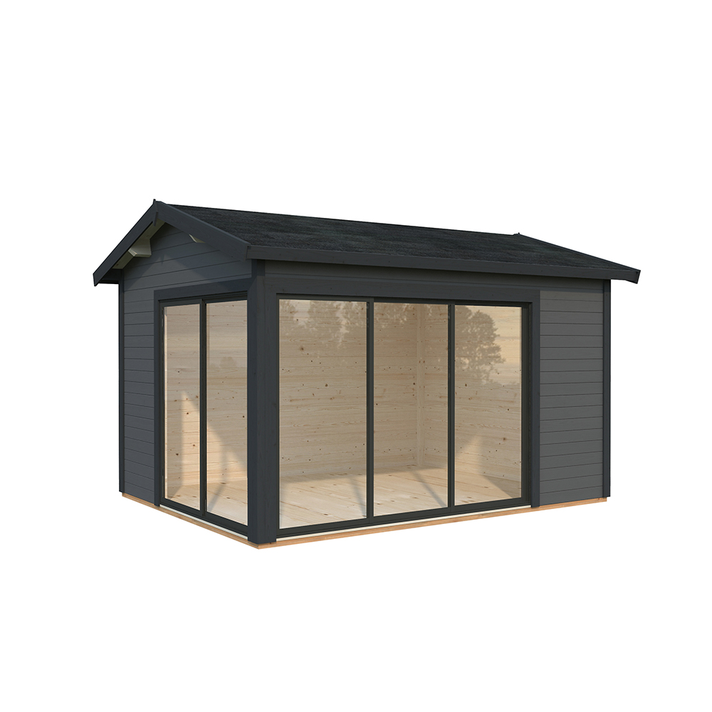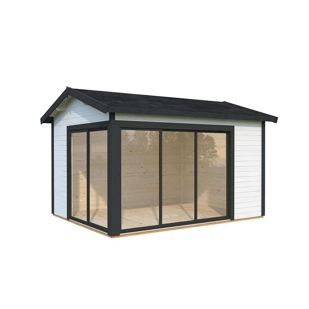 Stugan Amanda är perfekt som gäststuga, poolhus eller kontor för hemarbete. Den har praktiska skjutdörrar på två gavlar vilket gör att man kan öppna upp ordentligt mot trädgården och sudda ut gränsen mellan inne och ute.
