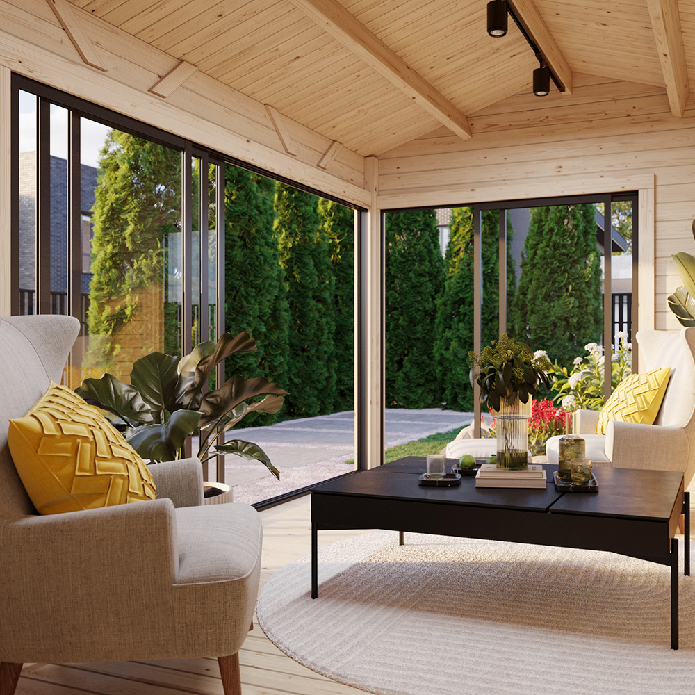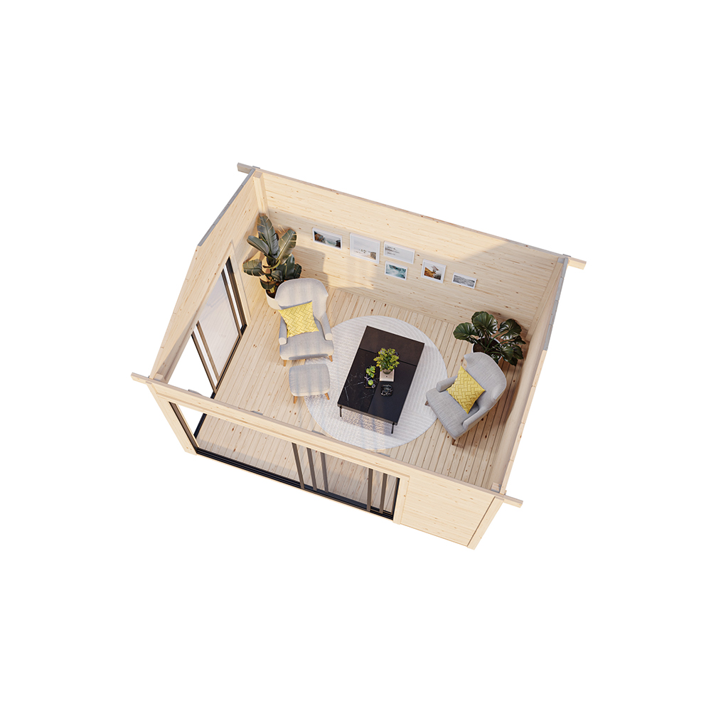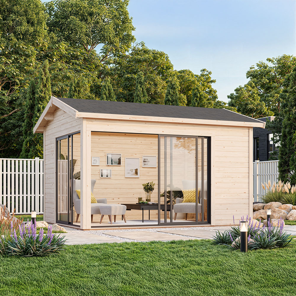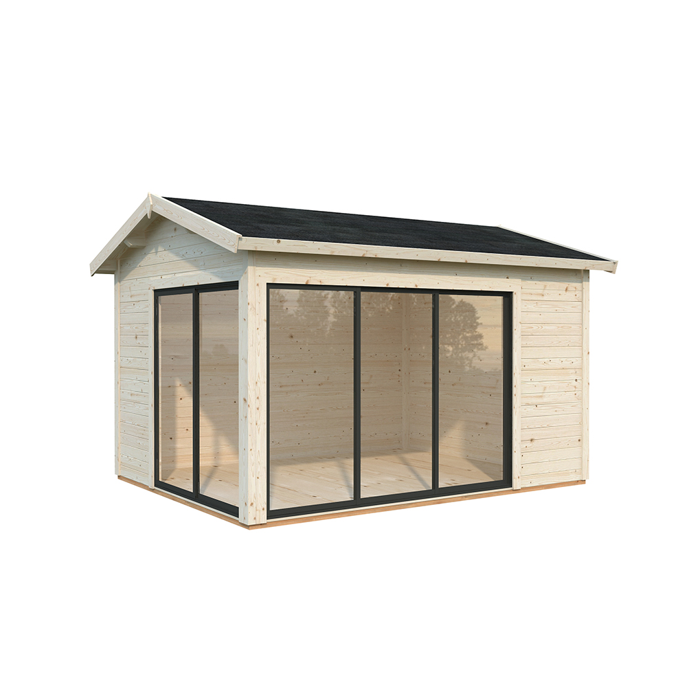 Stugan Amanda är perfekt som gäststuga, poolhus eller kontor för hemarbete. Den har praktiska skjutdörrar på två gavlar vilket gör att man kan öppna upp ordentligt mot trädgården och sudda ut gränsen mellan inne och ute.