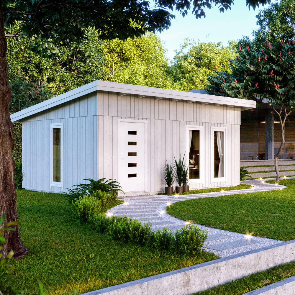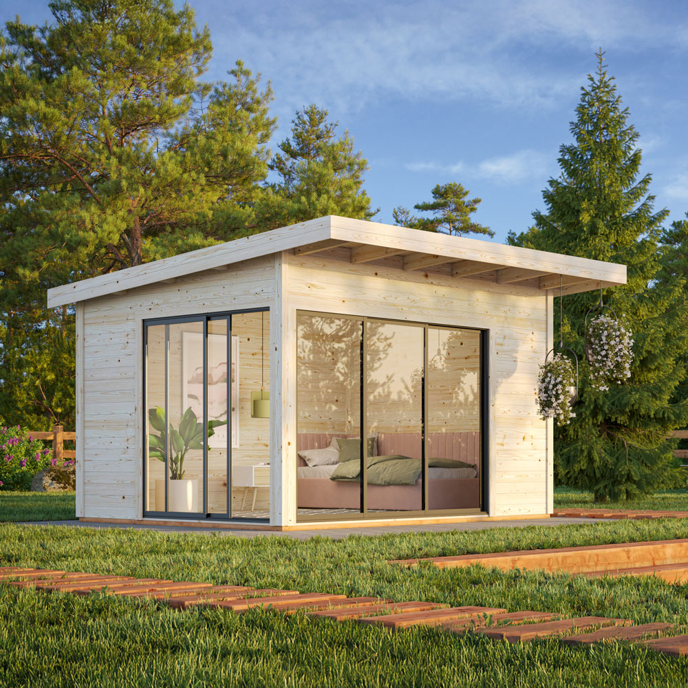 Andrea 11,7 m² Slide Plus är en modern och elegant stuga som kombinerar stilren design med funktionalitet och hög komfort. Denna uppgraderade modell är särskilt framtagen för dig som vill använda stugan även under vår och höst – perfekt som hemmakontor, ateljé eller ett mysigt extrarum nära naturen.