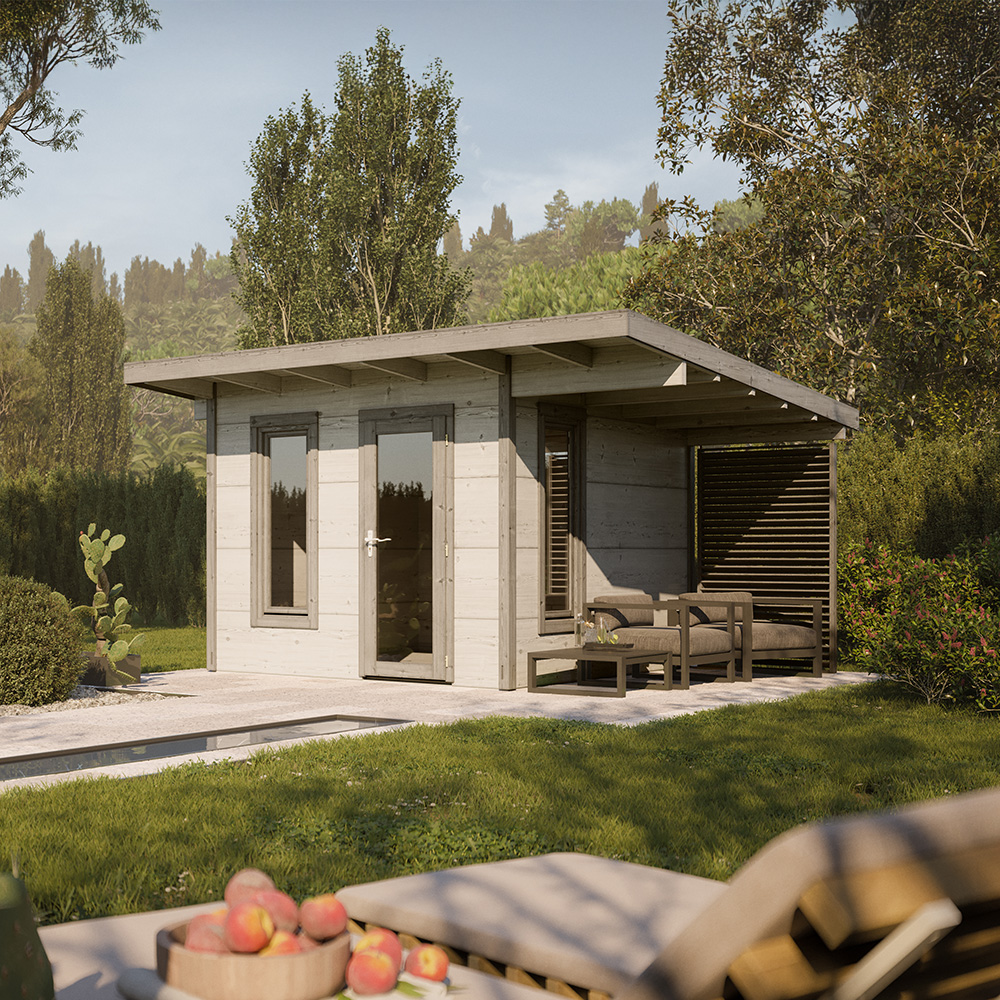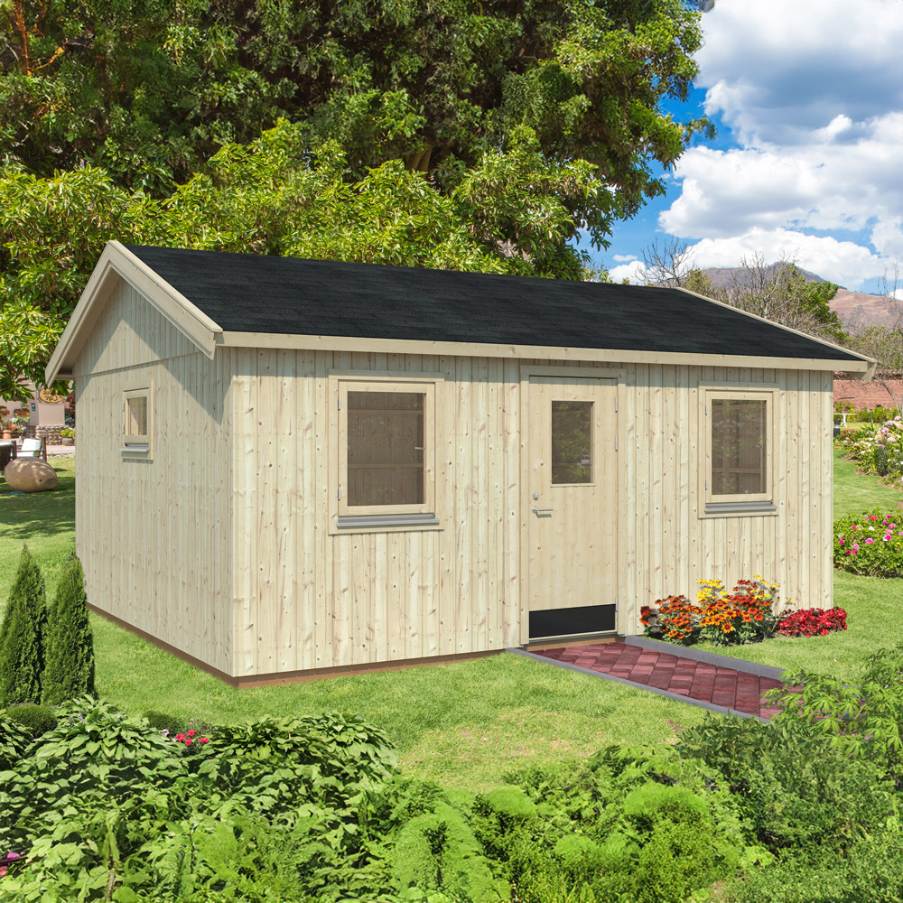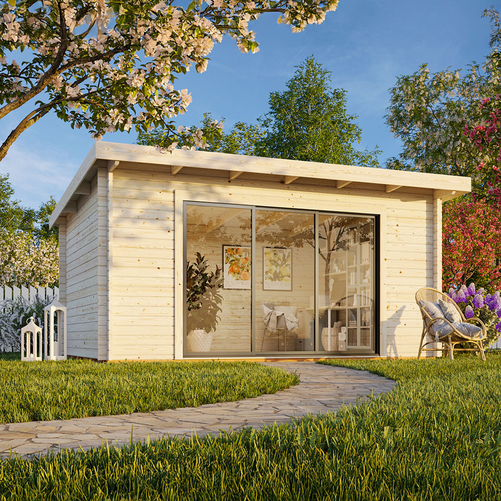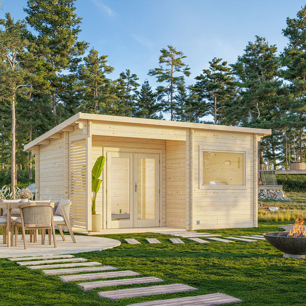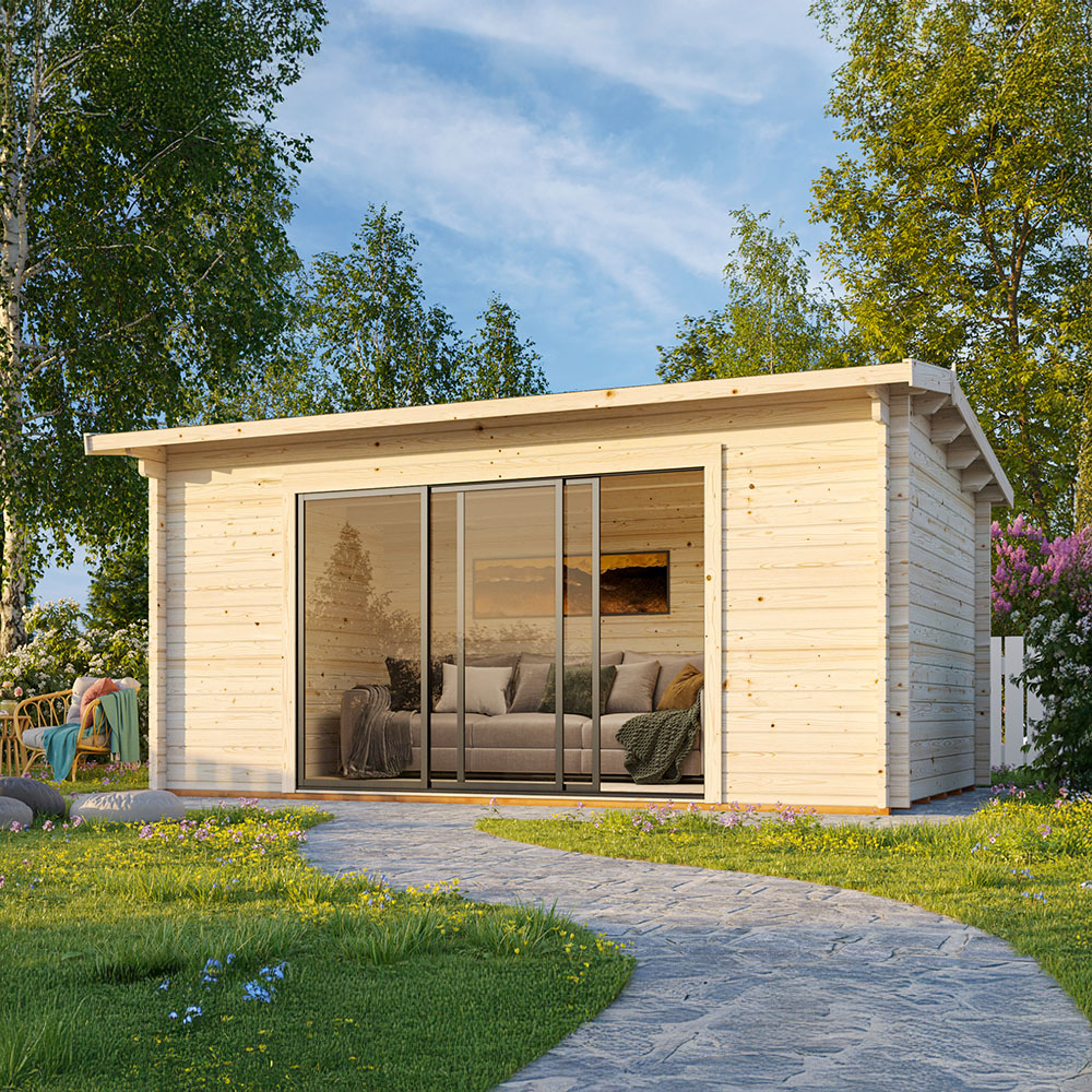 Andrea Slide Plus är byggd av FSC-certifierad nordisk gran med en kraftig väggtjocklek på 44 mm, vilket ger både stabilitet och grundläggande isolering. Takets flacka lutning på 4,4° och ett generöst taköverhäng på 82 cm ger huset en stilren och modern profil, samtidigt som det skyddar mot regn och snö. Ett slitstarkt 19 mm trägolv ingår.