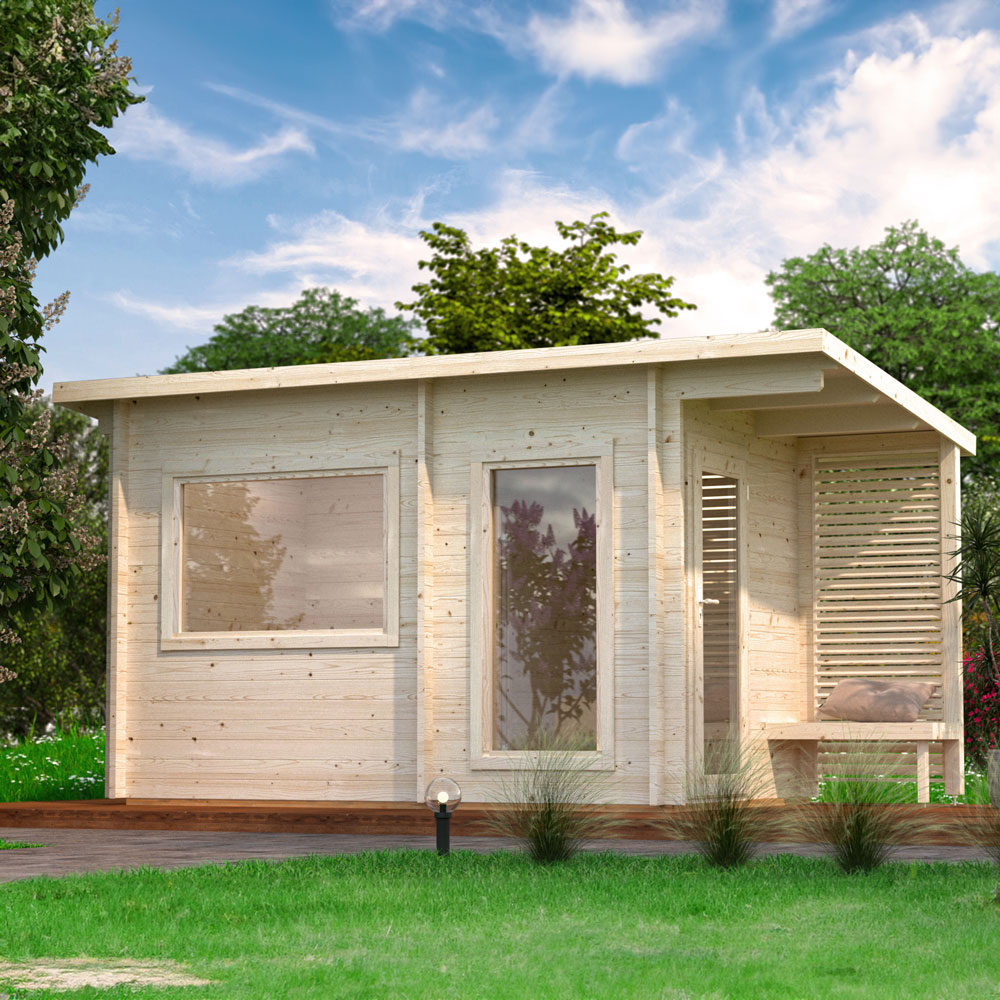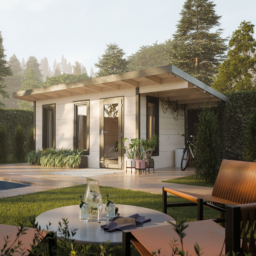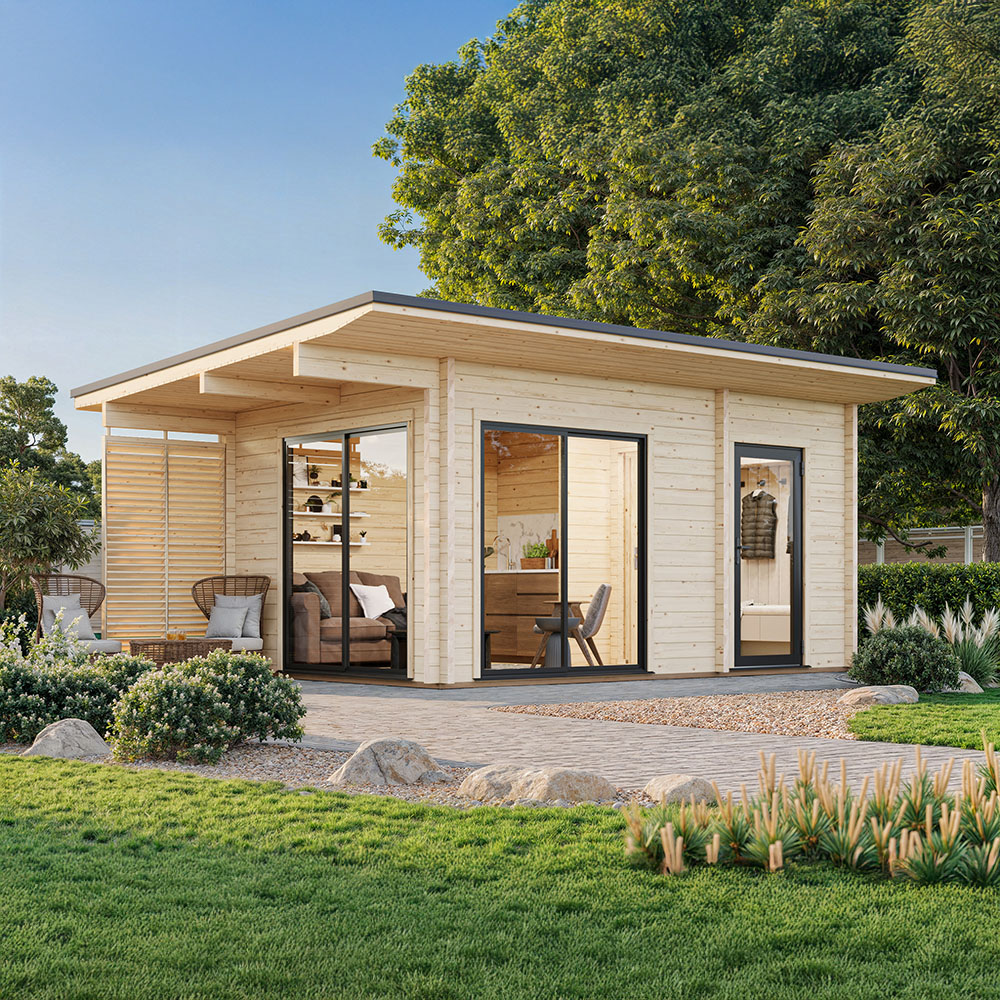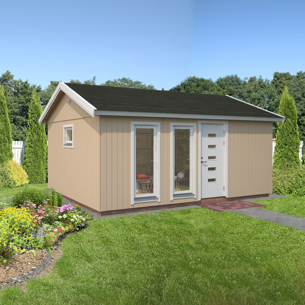 Andrea Slide Plus är byggd av FSC-certifierad nordisk gran med en kraftig väggtjocklek på 44 mm, vilket ger både stabilitet och grundläggande isolering. Takets flacka lutning på 4,4° och ett generöst taköverhäng på 82 cm ger huset en stilren och modern profil, samtidigt som det skyddar mot regn och snö. Ett slitstarkt 19 mm trägolv ingår.
