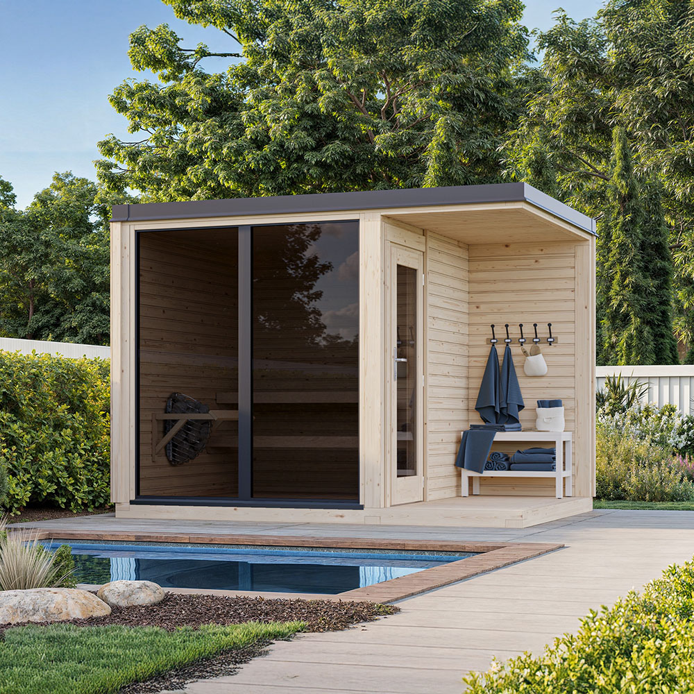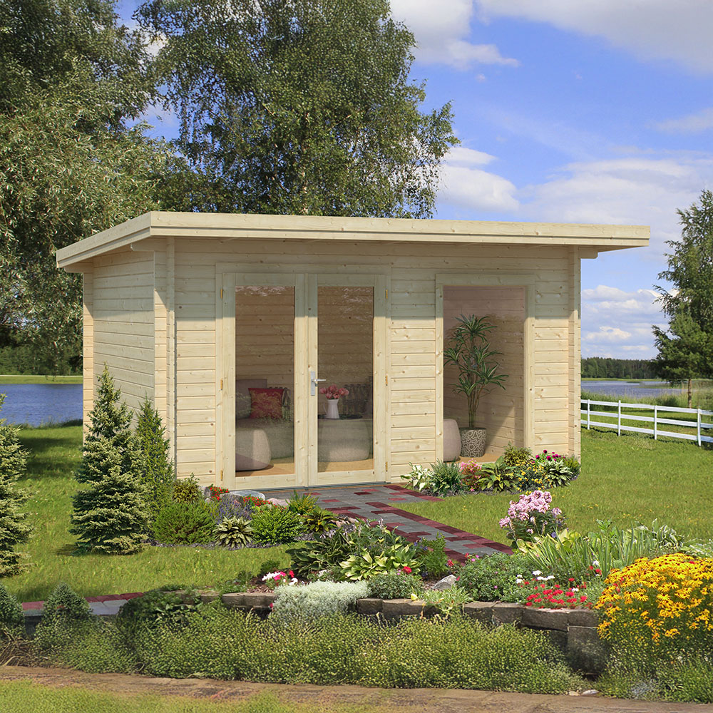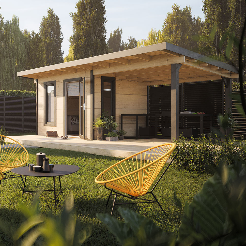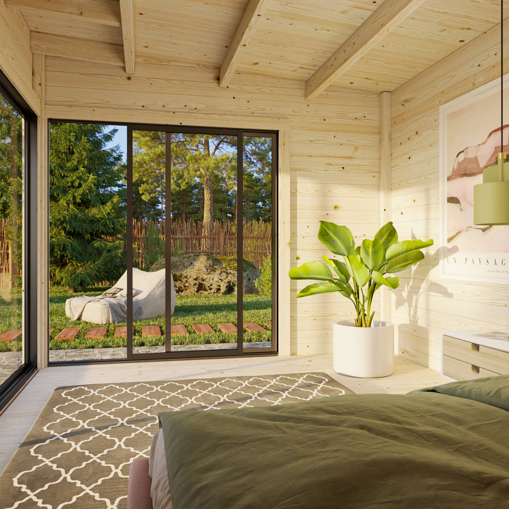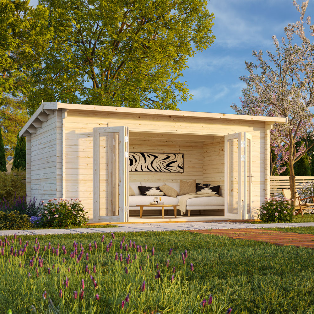 Andrea Slide Plus är byggd av FSC-certifierad nordisk gran med en kraftig väggtjocklek på 44 mm, vilket ger både stabilitet och grundläggande isolering. Takets flacka lutning på 4,4° och ett generöst taköverhäng på 82 cm ger huset en stilren och modern profil, samtidigt som det skyddar mot regn och snö. Ett slitstarkt 19 mm trägolv ingår.