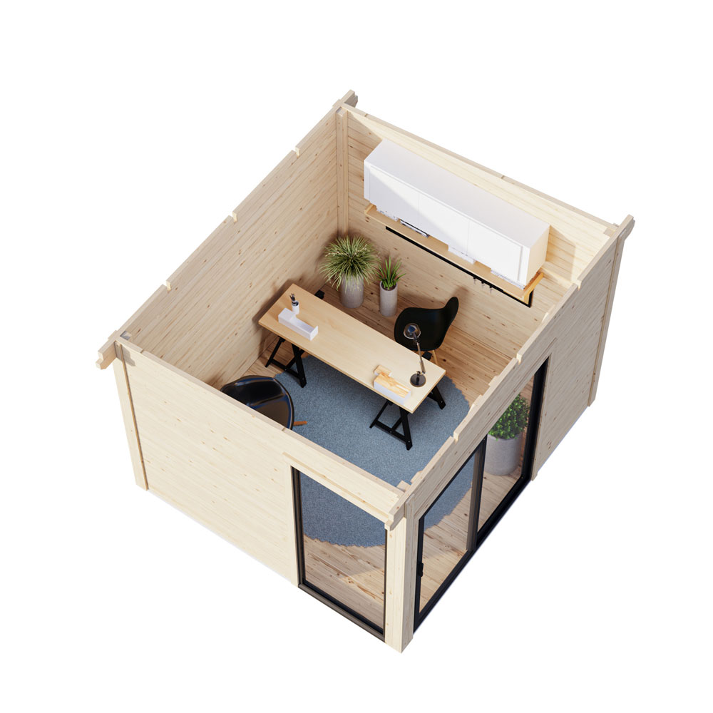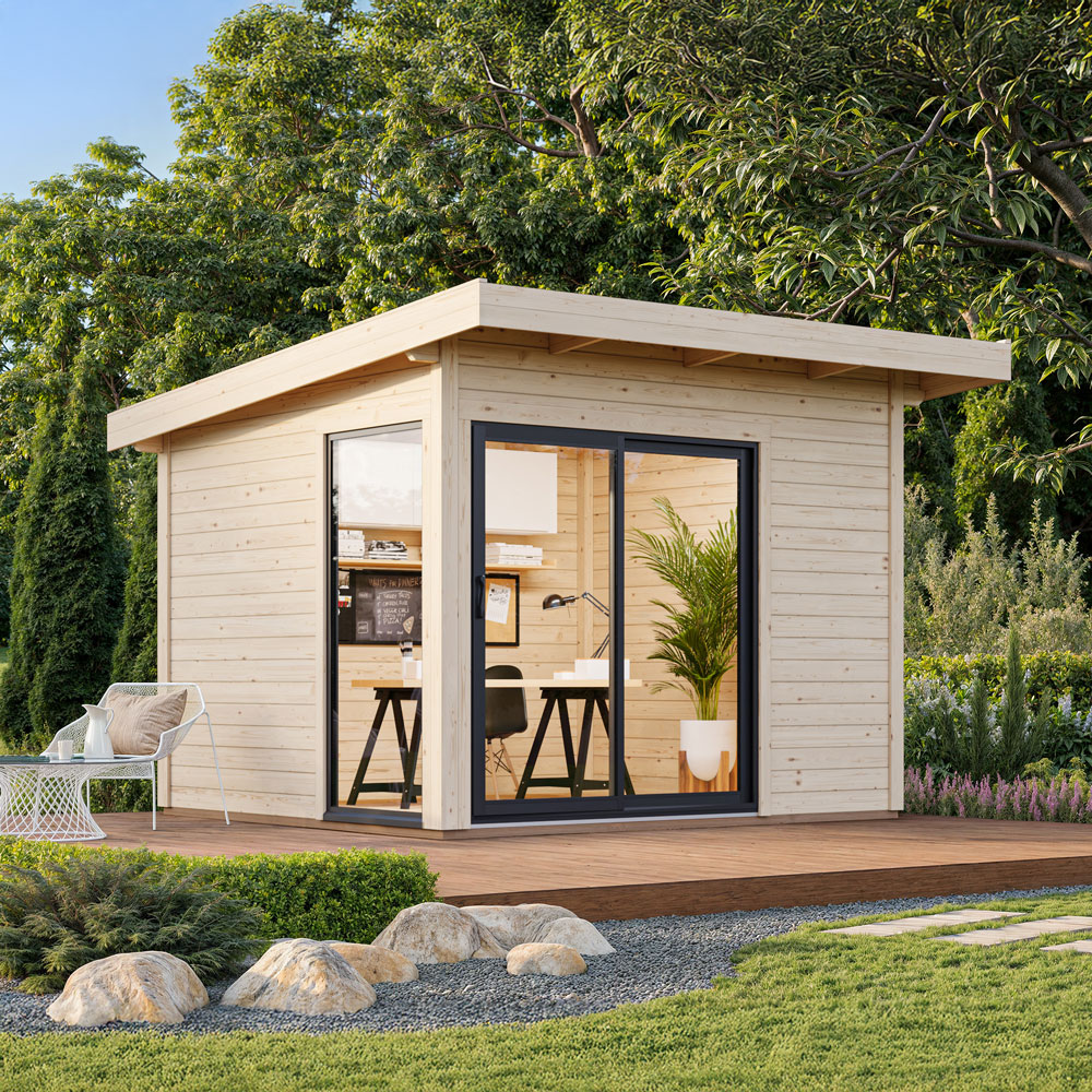 Andrea 8 m² Slide Plus är ett modernt och stilrent trädgårdshus som kombinerar funktionalitet med elegant design. Med sina stora glasytor och praktiska skjutdörrar skapas en ljus och inbjudande atmosfär, perfekt för användning som hemmakontor, ateljé eller avkopplande extrarum.