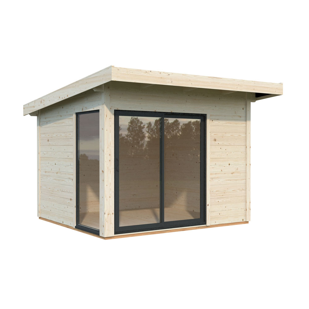 Andrea Slide Plus är tillverkat av hållbart nordiskt furu och har en väggtjocklek på 44 mm, vilket ger både stabilitet och god isolering. Det flacka pulpettaket med en lutning på 4,9° ger en modern profil och effektiv vattenavrinning. Huset levereras med ett 19 mm tjockt trägolv och har ett generöst taköverhäng på 60 cm framtill, vilket ger extra skydd mot väder och vind.