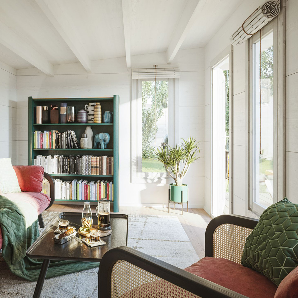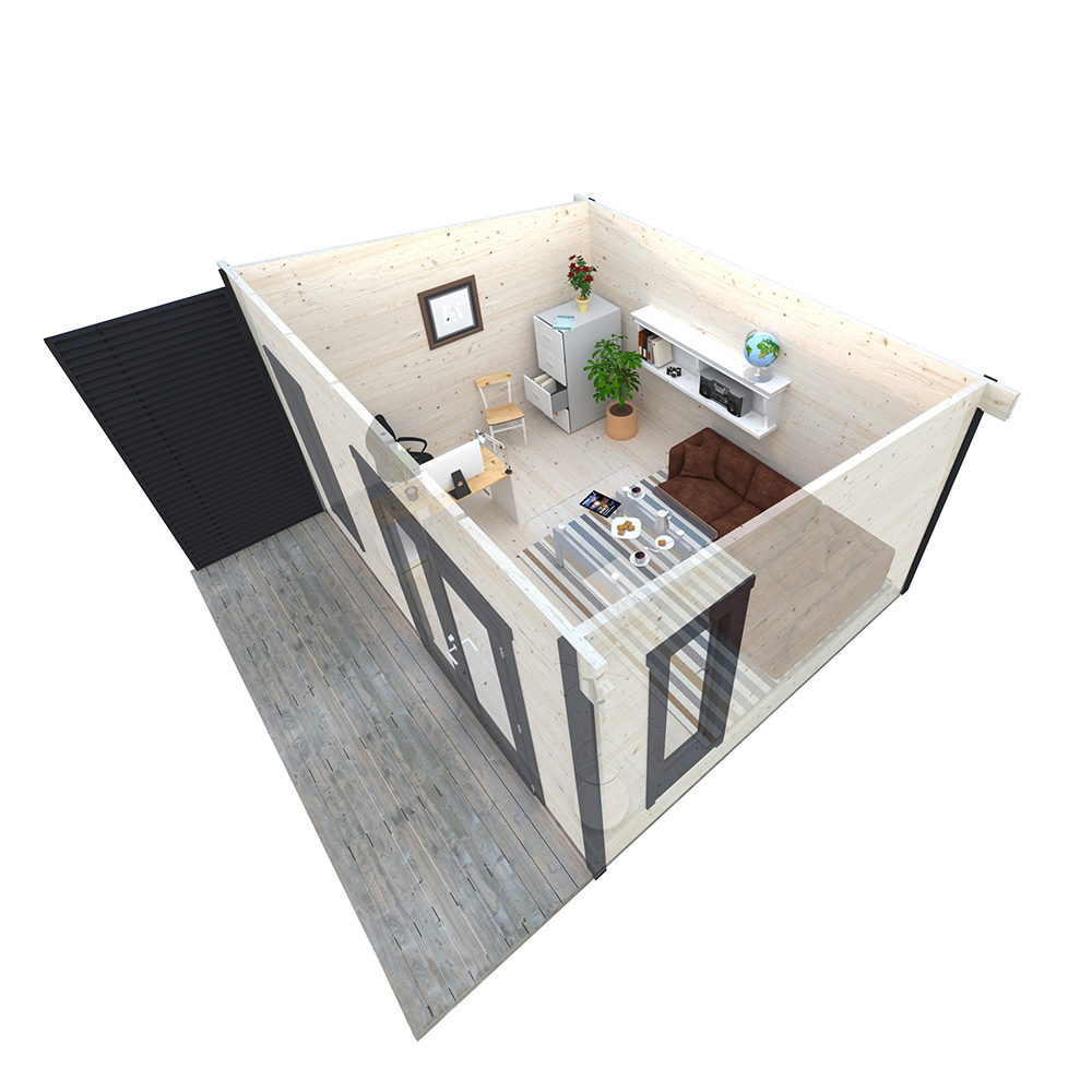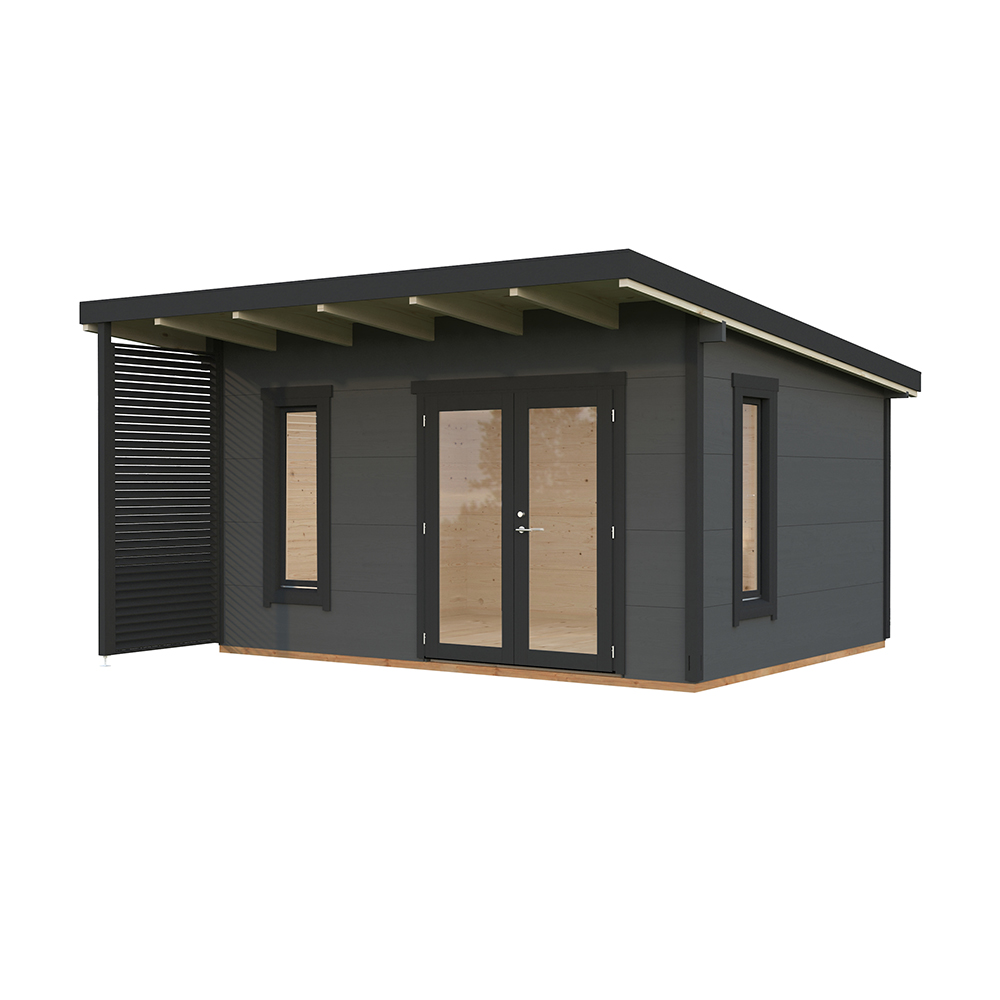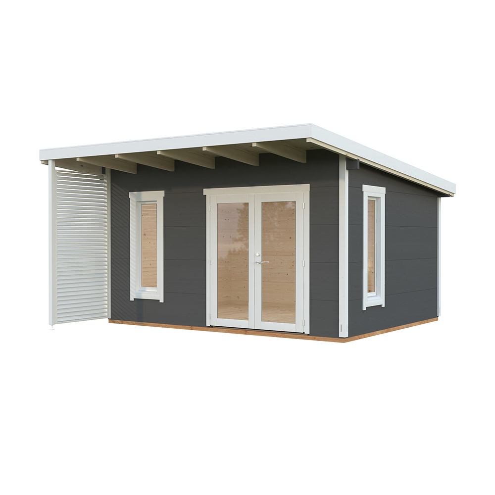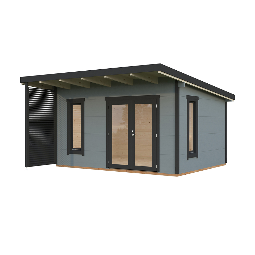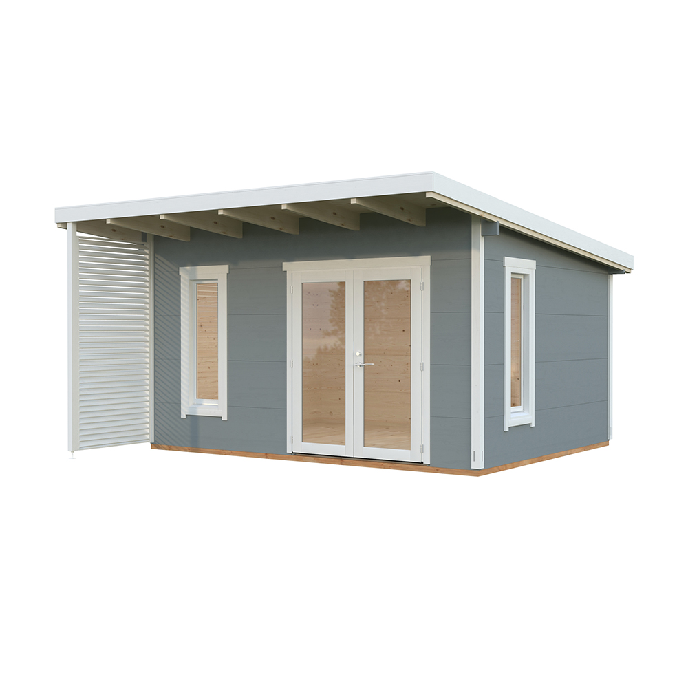 Grace har en massiv träkonstruktion som gör den till ett tåligt och stabilt tillskott i din trädgård. Här finns plats för både extra sängar för gästerna såväl som skrivbord för ditt hemarbete. Den snygga skärmen ger insynsskydd och skugga till den lilla uteplatsen under tak. Här kan dina gäster avnjuta dagens första kaffe efter en god natts sömn. Slå upp de stora glasdörrarna så suddas gränsen mellan ute och inne ut.