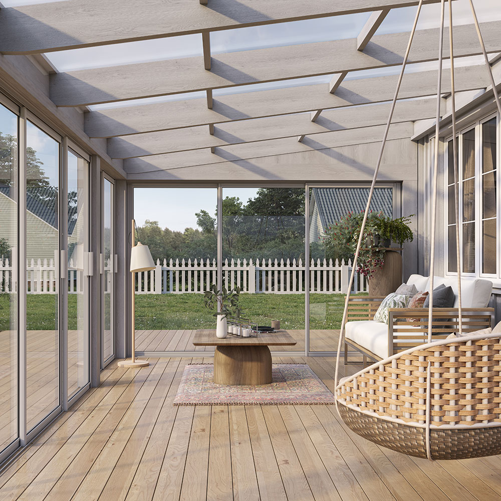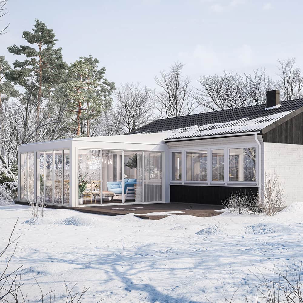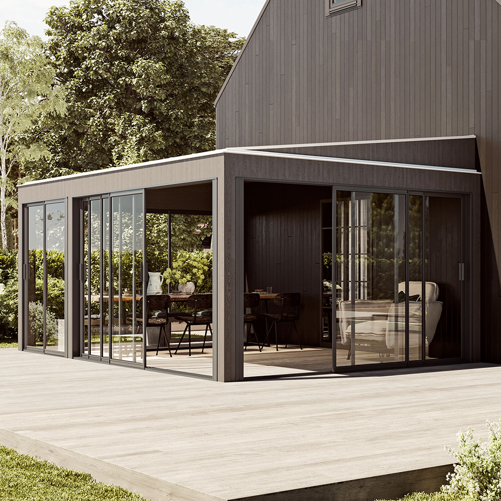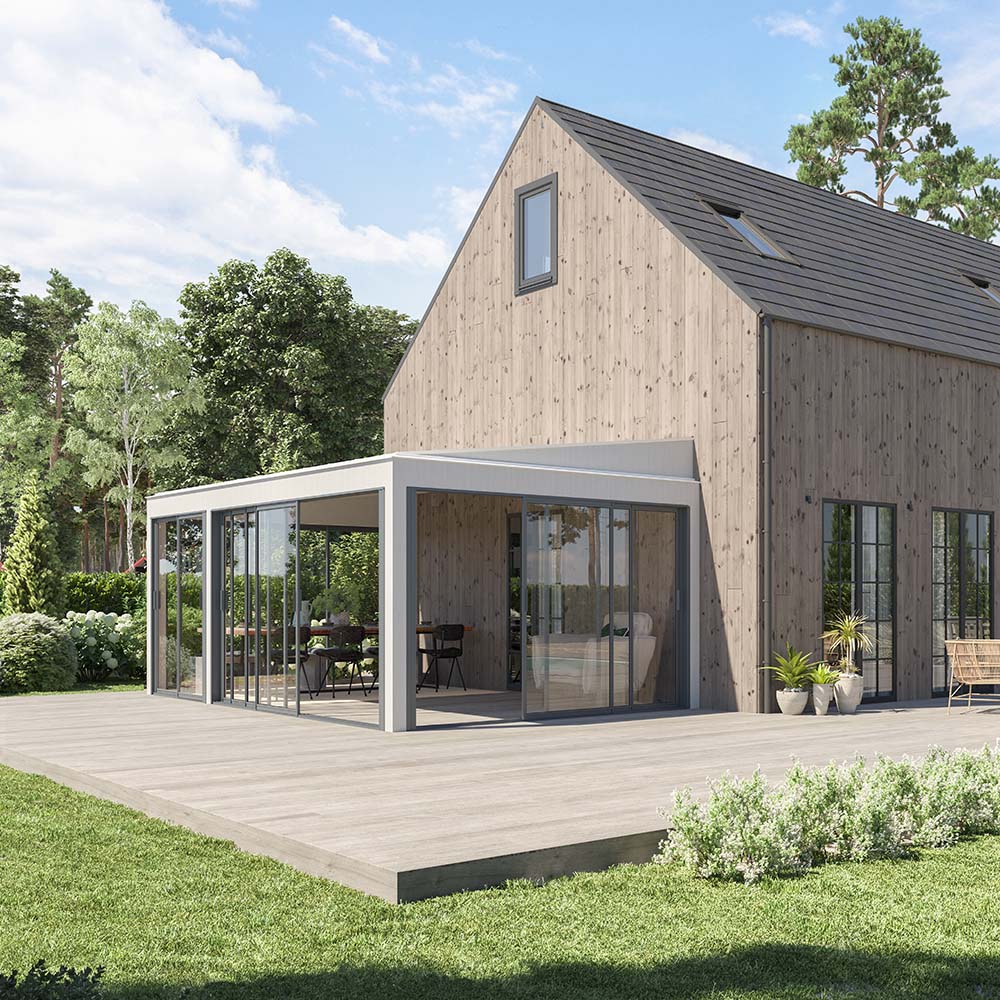 Vill du använda uterummet även under kallare årstider kan du enkelt välja glaspartier med annan isolerförmåga. Du kan också bestämma om du vill ha fönster eller panel på sidorna och på så sätt anpassa insynen till ditt hus eller din tomt.