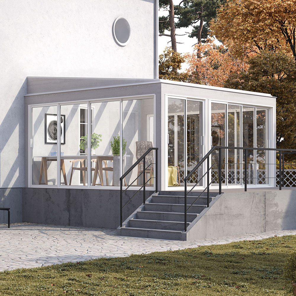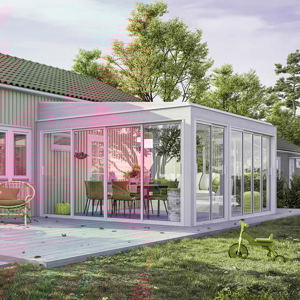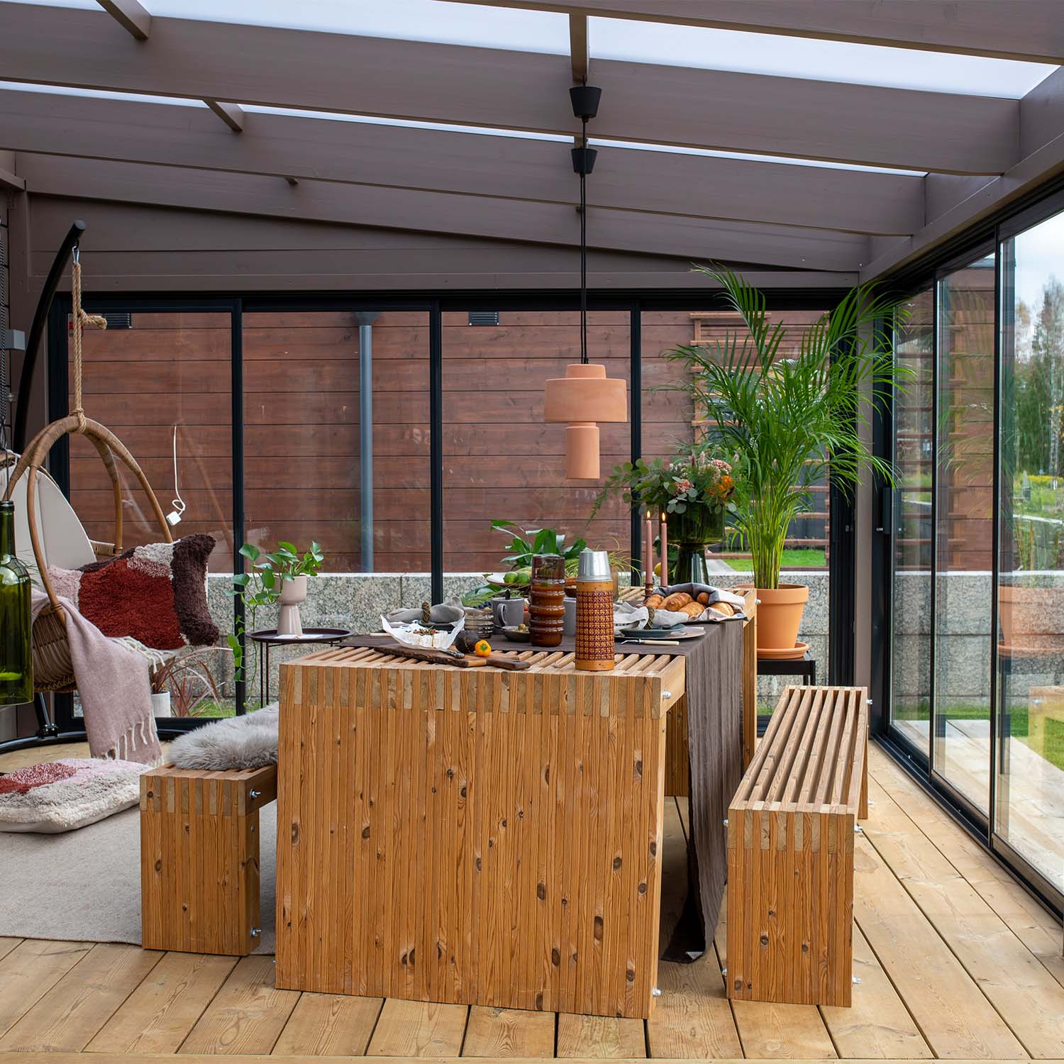 Vill du använda uterummet även under kallare årstider kan du enkelt välja glaspartier med annan isolerförmåga. Du kan också bestämma om du vill ha fönster eller panel på sidorna och på så sätt anpassa insynen till ditt hus eller din tomt.