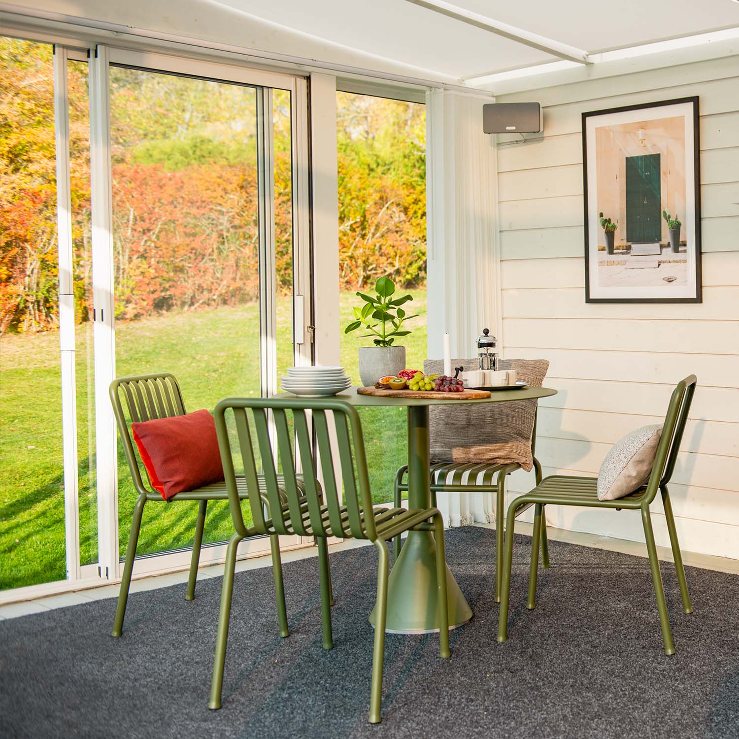 Ditt uterum levereras med våra vidareutvecklade kanalplasttak som nu är ännu bättre och enklare att montera. Anpassat efter den säsong du valt. Taket är tillverkat i polykarbonat och håller för hårda påfrestningar, precis som ett tak av god kvalitet ska göra. Läs mer om våra kanalplasttak här.