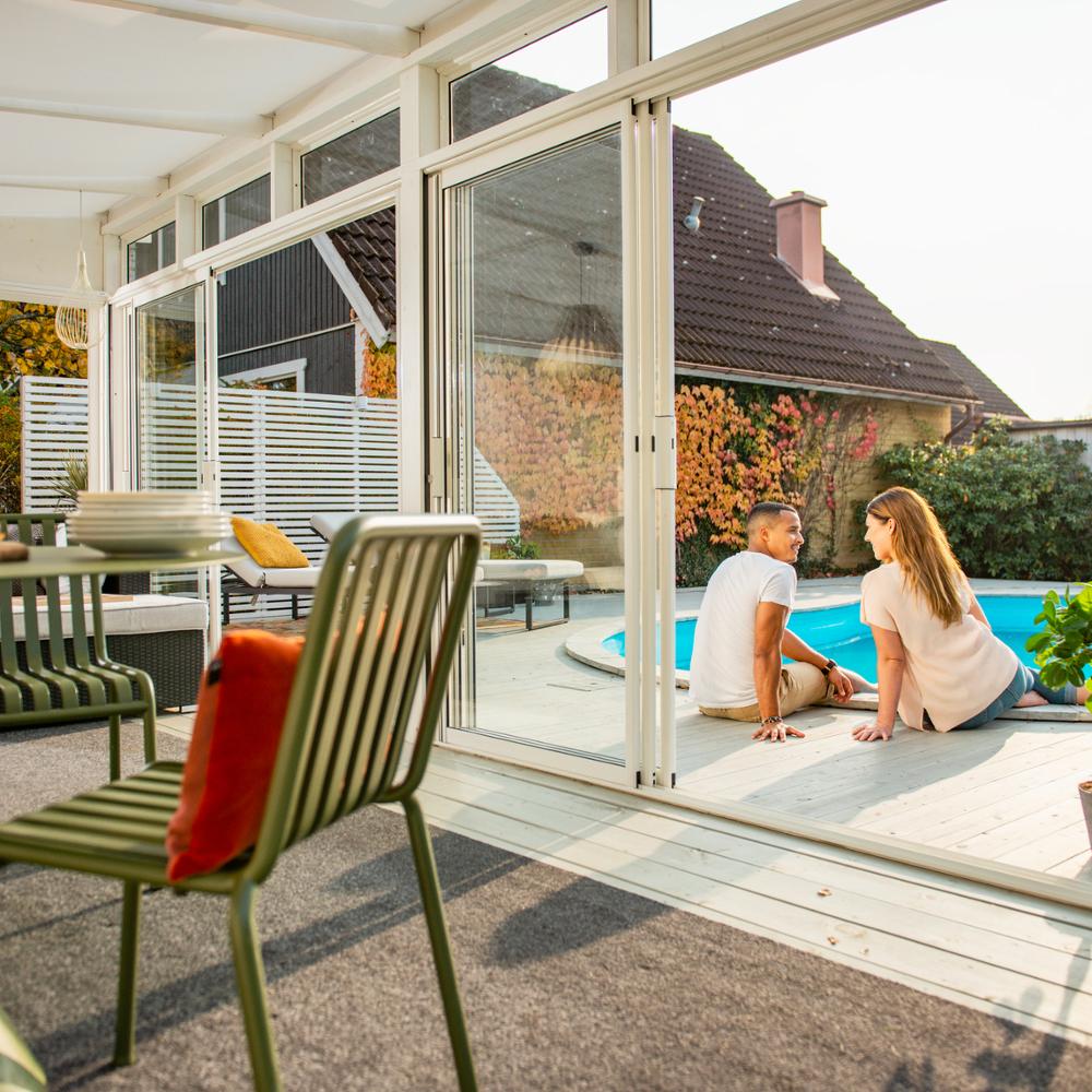 Ditt uterum levereras med högkvalitativa skjutdörrspartier med säkerhetsglas, anpassade efter den säsong du valt. Profilerna är snyggt designade i underhållsfritt aluminium och kan fås i olika färger. Våra egendesignade uterumspartier är svensktillverkade och håller mycket hög standard. I våra färdiga uterumspaket får du alltid den uppgraderade karmen Original Design (sommar, vår/höst) eller den lika snyggt designade karmen Vinter Izo (vinter).