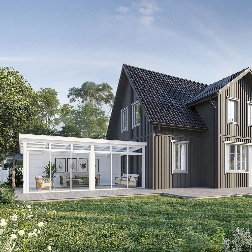 Det optimala valet för dig som är ute efter ett uterum anpassat för det svenska sommarhalvåret. Uterumspartier: Optimal skjutdörrspartier Tak: 10 mm kanalplasttak