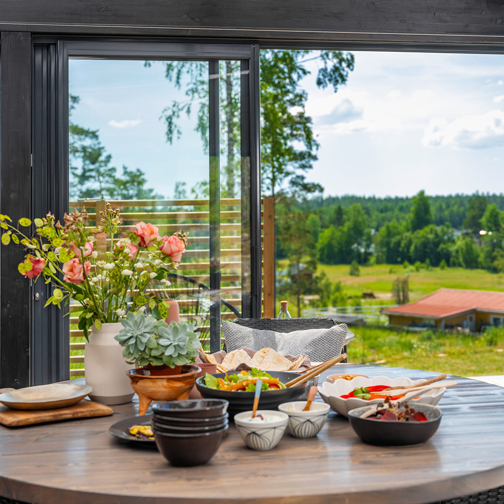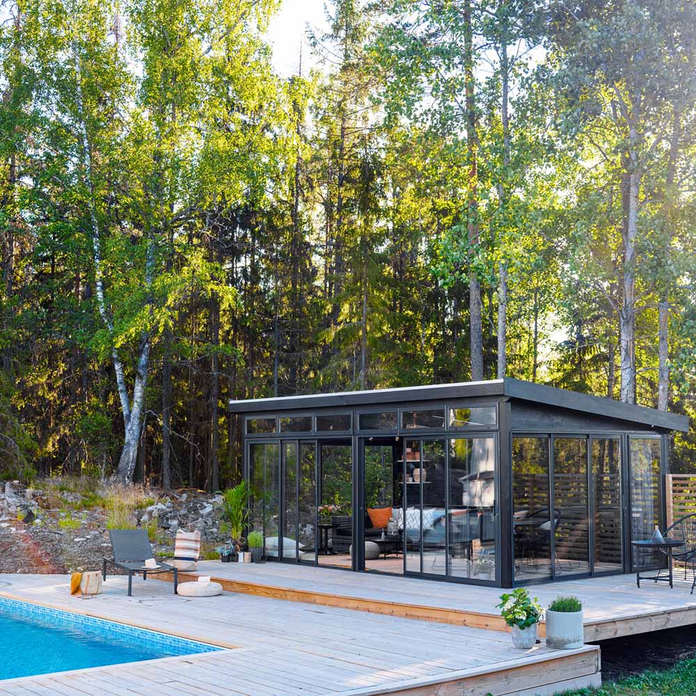 Förstärk utekänslan och gör ditt rum mer öppet och ljust med ett glastak. Kolding uterum är fristående, kan placeras var du vill på tomten (sålänge du följer gällande regler) och har många användningsområden. Förutom att du kan skapa den perfekta platsen för umgänge väljer många att ha det som t.ex. ett poolrum. Men vi har även sett det användas som både ateljé och yogastudio. Det bakåtlutande taket och den extra fönsterraden gör att du får en härlig rymdkänsla och ett fantastiskt ljusinsläpp.