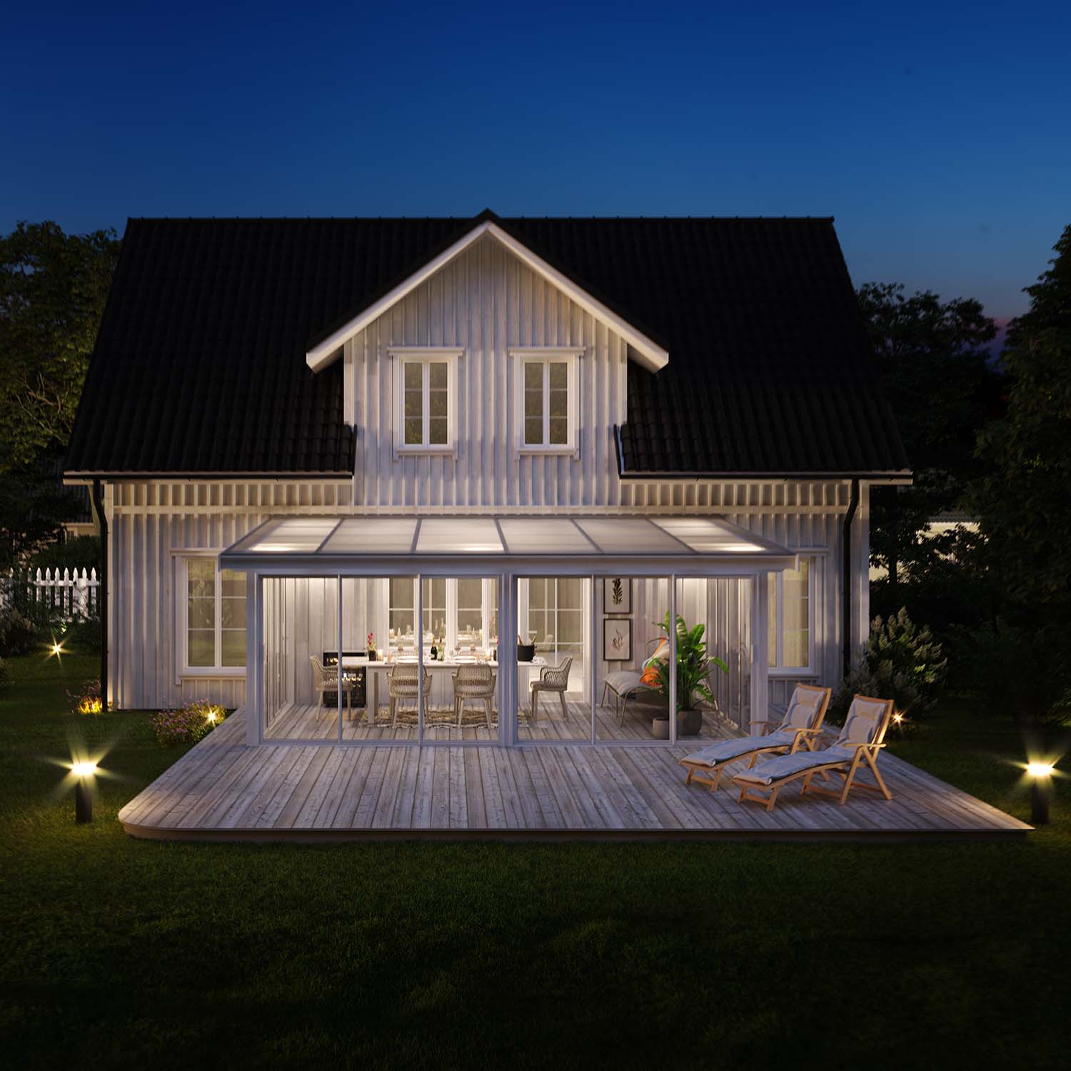 Det optimala valet för dig som är ute efter ett uterum anpassat för det svenska sommarhalvåret. Uterumspartier: Optimal skjutdörrspartier Tak: 10 mm kanalplasttak