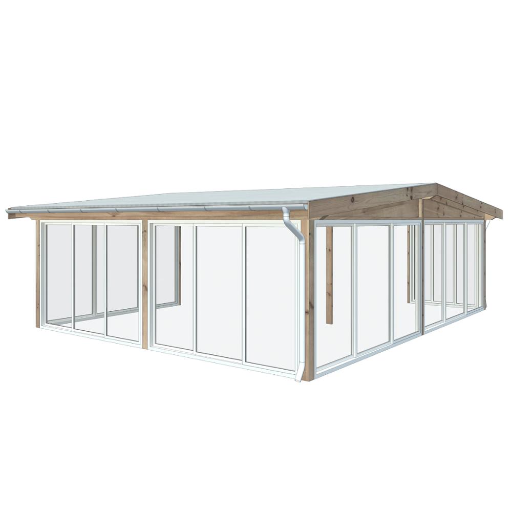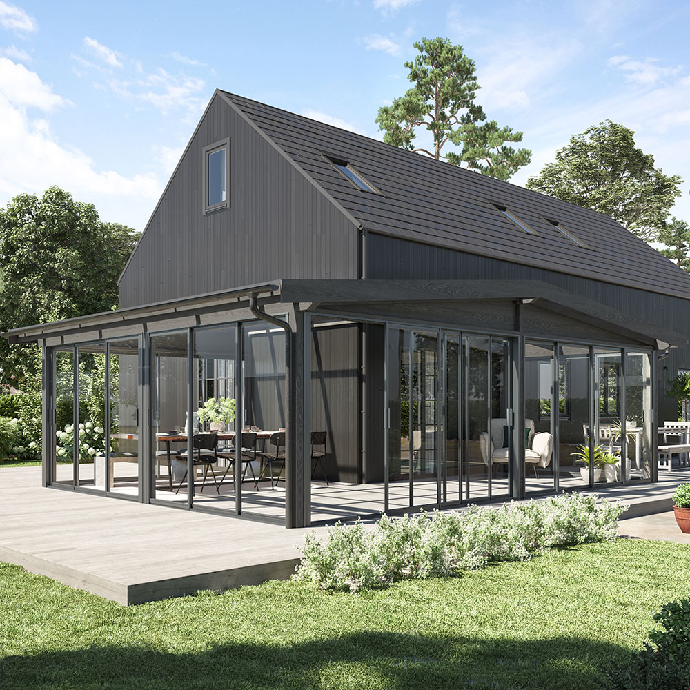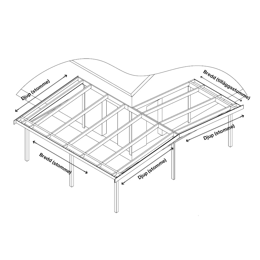 Uterummet består av stommen från modellen Vallda och vinkeln skapas genom att montera en påbyggnadsstomme som vid monteringen kan spegelvändas och användas på önskad sida. Anpassa design, storlek, färg och isolerförmåga och njut av ljusinsläpp, rymd och utemiljö oavsett säsong.