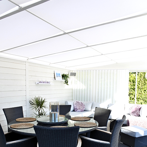 Skuggtaksrullgardinen erbjuder behaglig skugga och skönare klimat när det är varmt ute, men även isolering vid kallt väder. Minskar värmeinstrålningen med ca 55%. Isolereffekten är 40%.