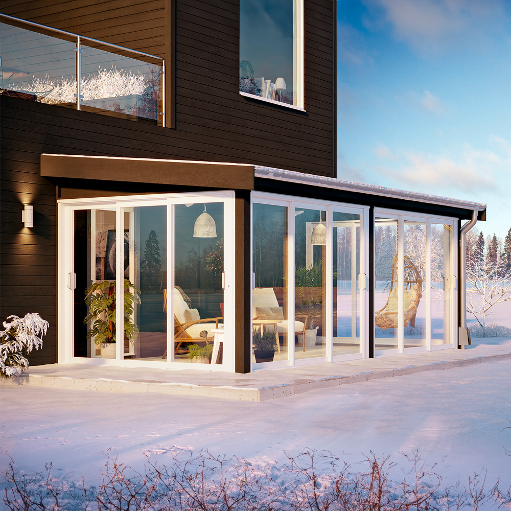 Finns med 2, 3, och 4-luckor, i bredder från 140 - 410 cm. Anpassa ditt inglasade uterum efter dina egna önskemål och komplettera med fasta partier i samma serie. Välj mellan vita eller svarta partier. De svarta partierna är lackade i en strukturlack som är både mer hållbar och ger ett snyggare resultat.
