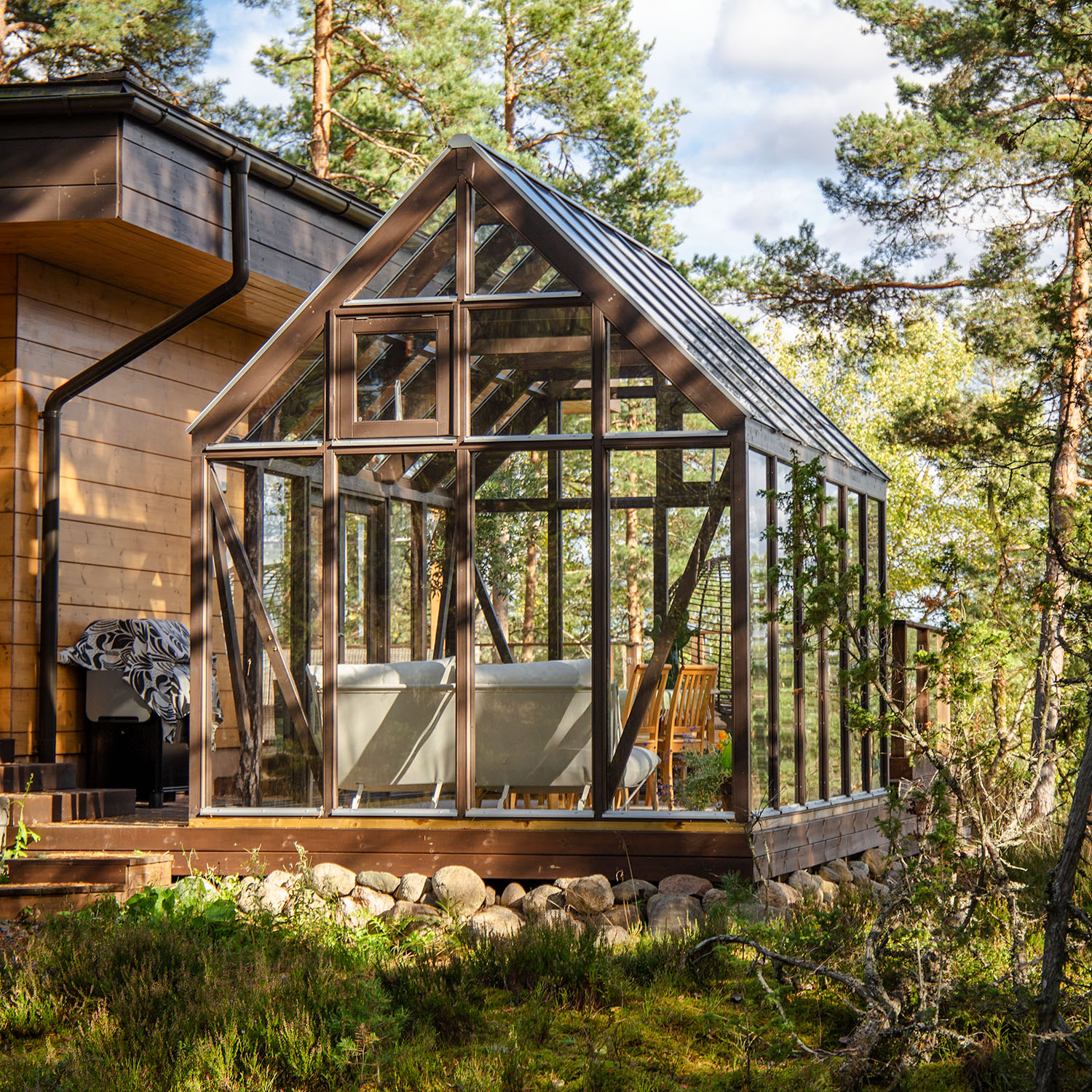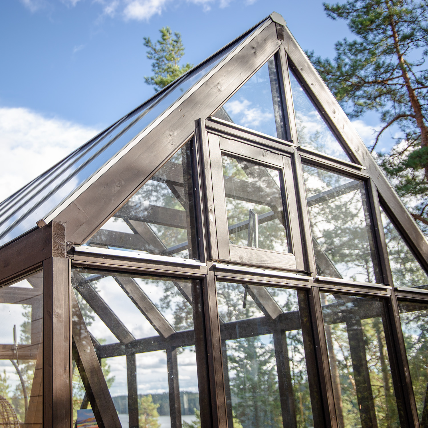 Välkommen in genom de gedigna dubbeldörrarna. Du kan själv välja om du vill placera dubbeldörren på kort- eller långsidan, så att det passar placeringen i just din trädgård. De stora glasytorna i tak och väggar suddar ut gränsen mellan inne och ute och skapar en känsla av att vara nära naturen. Med 3,4 meter i takhöjd får du en härlig rymd och de två vädringsfönstren med automatiska fönsteröppnare ger en bra cirkulation av luften. Sarek är godkänt upp till snözon 3.
