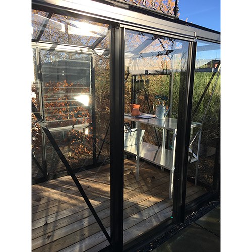 När du köper växthuset Tyresta Senior får du med en skjutdörr men ibland finns det ett behov av en extra bred ingång. Du kanske enkelt vill kunna bära stora lådor in eller ut ur växthuset eller köra in med en skottkärra ibland? Då behöver du en extra skjutdörr för att bredda ingången. Lås ingår.