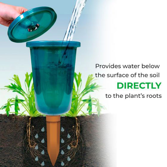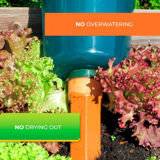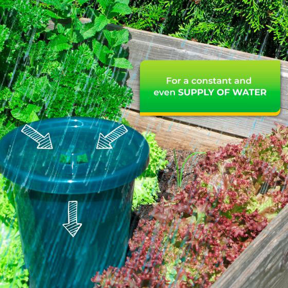 Med automatisk bevattning får växterna alltid rätt mängd vatten när de behöver det. Sätt bara ner spikarna i jorden och fyll behållaren med vatten så är du klar. Vattningsspiken har utformats speciellt för att fördela vattnet och rikta in sig på växtrötterna så snart jorden börjar torka i den upphöjda bädden. 2,5 liters vattenbehållare med nivåindikator säkerställer exakt vattning i upp till 14 dagar. Högkvalitativ design, perfekt för upphöjda odlingsbäddare, planteringar, blomlådor och i växthuset. Locket med en öppning för regnvatten förhindrar fallande löv och grenar från att komma in i vattenbehållaren.