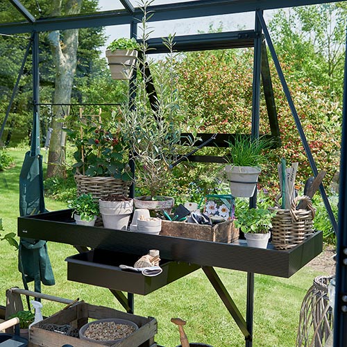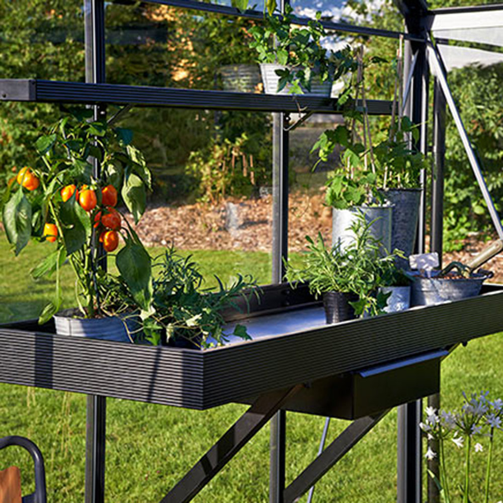 Detta funktionella och fina väggmonterade bord ger dig möjlighet att få upp dina odlingskrukor i en bra arbetshöjd och sparar plats i ditt växthus. Det fungerar utmärkt som planteringsbord när det är dags att sköta om dina växter.