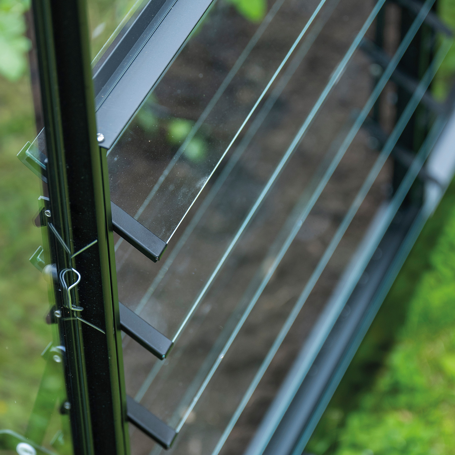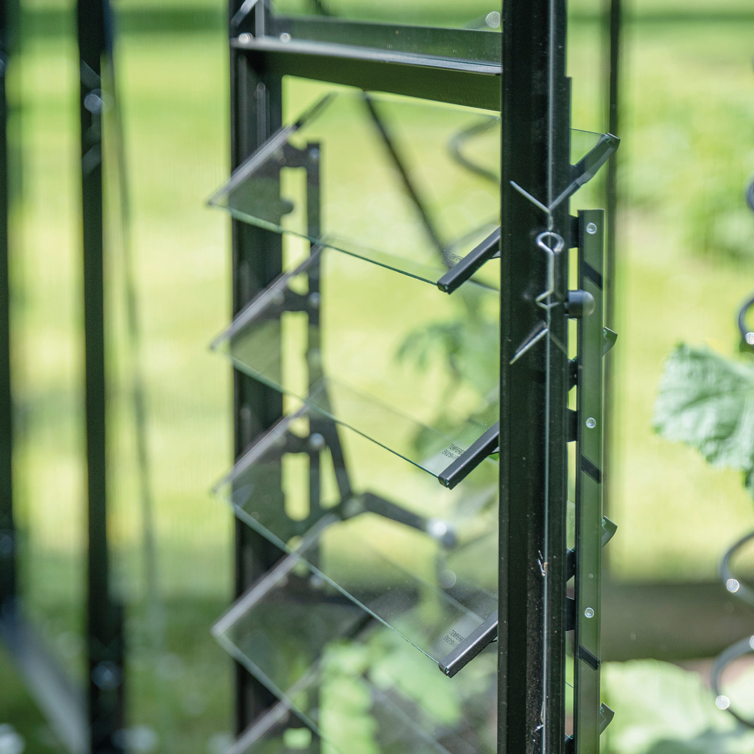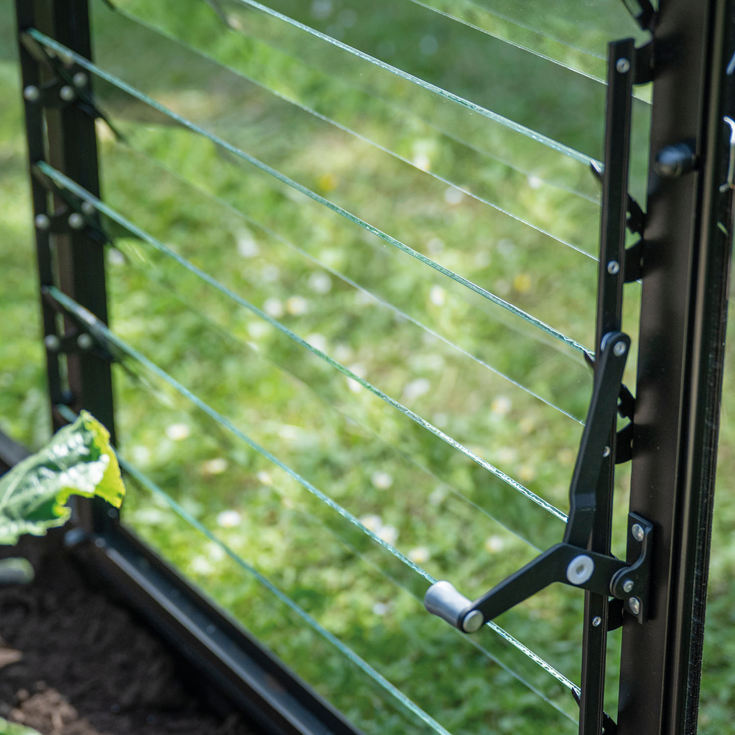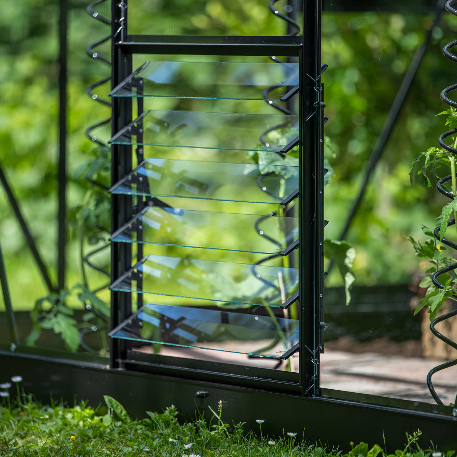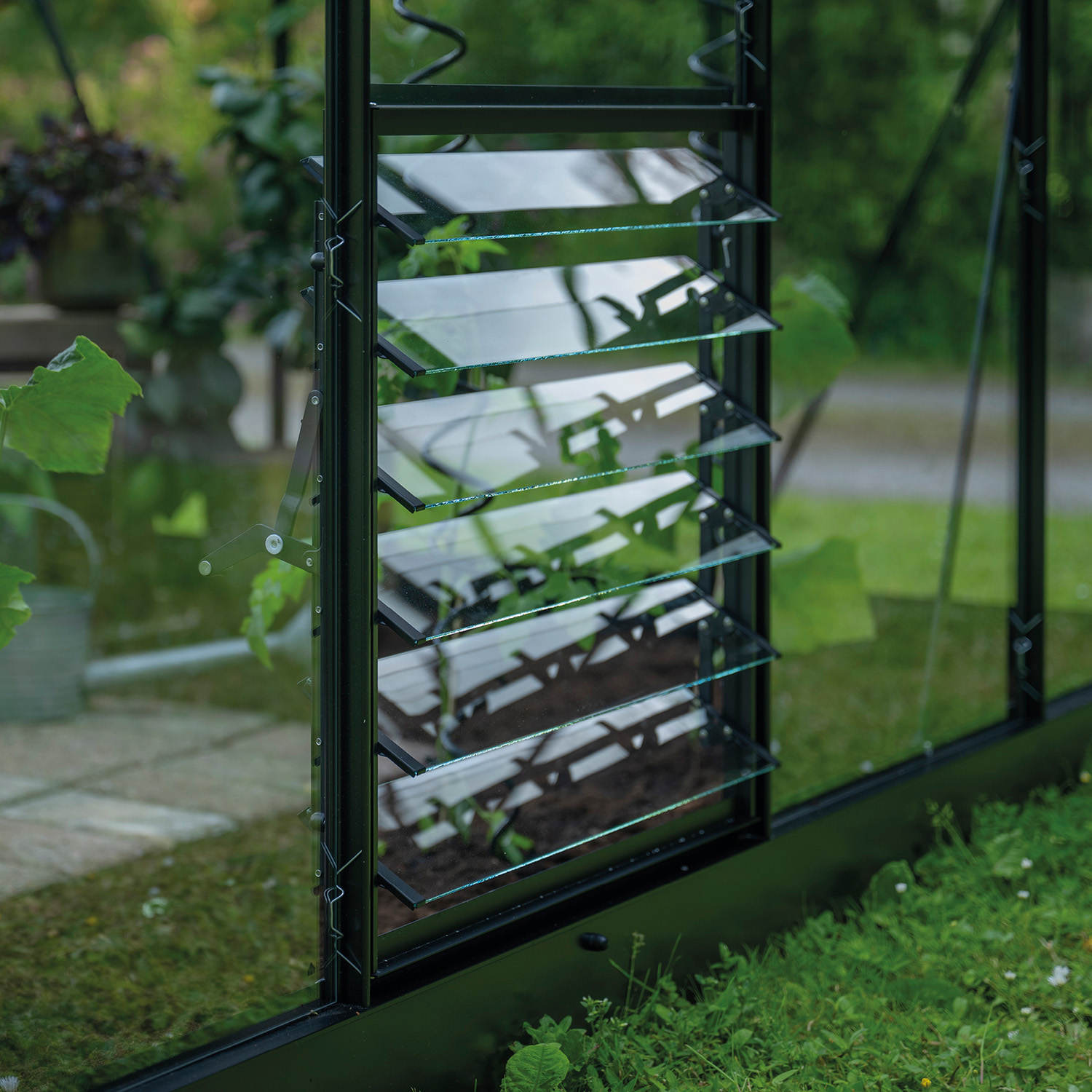 Du justerar enkelt öppningen manuellt efter väder och behov. Tillsammans med öppna takfönster skapas ett naturligt luftflöde som hjälper till att hålla temperaturen nere och minska kondens i växthuset.