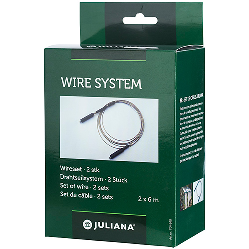 I systemet ingår två plastbelagda vajrar som är 6 meter långa med passande infästningssystem.