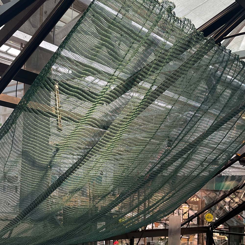 Grön plastväv. Plastkrokar för upphängning. Plastklädd ståltråd.