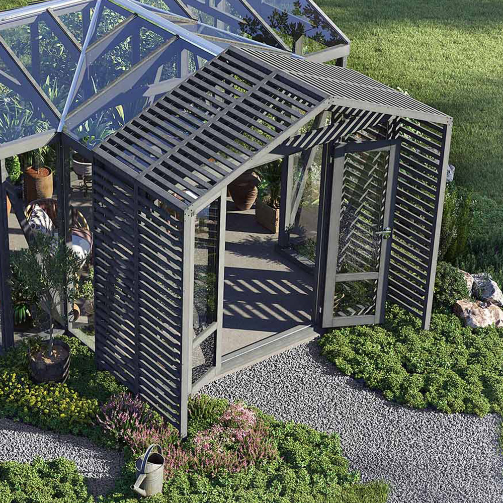 En sektion solskydd är anpassad för att täcka en glassektion på växthuset. Om du köper två eller flera sektioner kan du välja att montera skydden så att de sticker fram över ena gaveln för att skapa en veranda till ditt växthus.