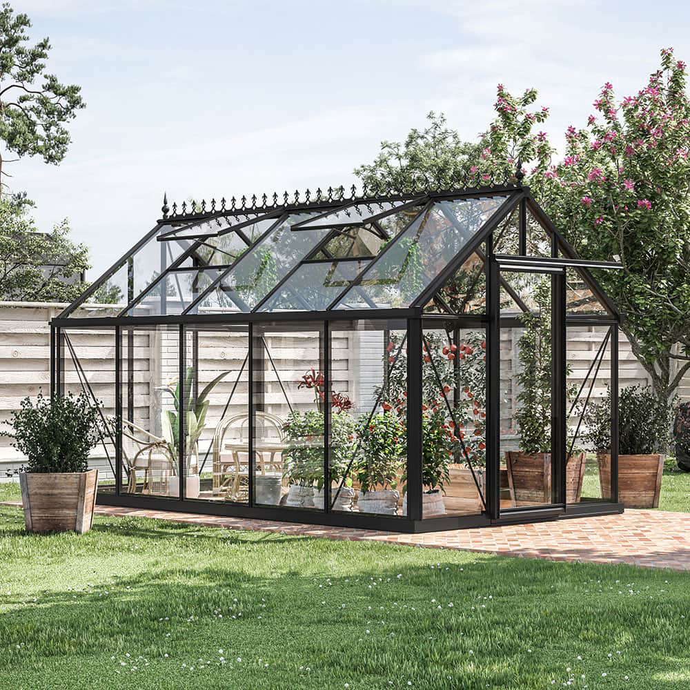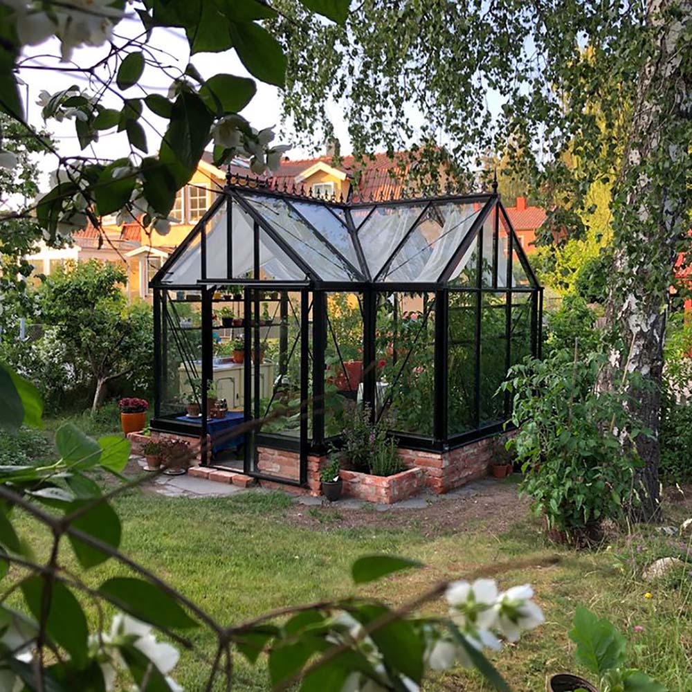 STIL Välj växthus i obehandlad aluminium eller victorian med svart pulverlackering. Nockdekorationen ingår inte utan är ett tillval som finns för de svarta modellerna.